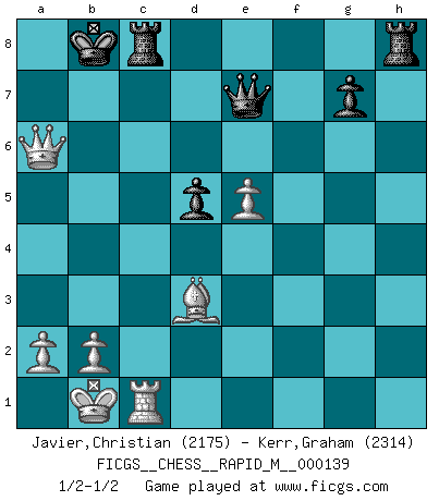 Last move : 1/2-1/2 2023 March 23 12:5:43 [Event "FICGS__CHESS__RAPID_M__000139"] [Site "FICGS"] [Date "2022.12.04"] [Round "1"] [White "Javier,Christian"] [Black "Kerr,Graham"] [Result "1/2-1/2"] [WhiteElo "2175"] [BlackElo "2314"] 1.d4 d5 2.c4 c6 3.Nf3 Nf6 4.e3 Bf5 5.Nc3 e6 6.Nh4 Bg6 7.Qb3 Qc7 8.Nxg6 hxg6 9.Bd2 Nbd7 10.cxd5 exd5 11.h4 g5 12.g3 gxh4 13.gxh4 O-O-O 14.O-O-O Bd6 15.f3 Kb8 16.Kb1 Nf8 17.e4 Bf4 18.Nb5 cxb5 19.Rc1 Nxe4 20.fxe4 Qd6 21.e5 Qh6 22.Bxf4 Qxf4 23.Bxb5 Ne6 24.Rhf1 Qxh4 25.Rxf7 Nxd4 26.Rxb7+ Ka8 27.Rxa7+ Kxa7 28.Qa4+ Kb8 29.Bd3 Qe7 30.Qxd4 Rc8 31.Qb6+ Ka8 32.Qa6+ Kb8 33.Qb6+ Ka8 34.Qa6+ Kb8 1/2-1/2 Follow this game move after move (download)Though most people love to look at the games of the great attacking masters, some of the most successful players in history have been the quiet positional players. They slowly grind you down by taking away your space, tying up your pieces, and leaving you with virtually nothing to do ! (Yasser Seirawan) Sitze auf Deine Hände. (Siegbert Tarrasch) Los Peones son nacidos libres, y aún así, se encuentran por doquier encadenados. (Rick Kennedy) Comme les marins qui ont mille raisons différentes d'aller en mer, les joueurs d'échecs en ont tout autant avant de s'installer devant une table et jouer... (Vincent Bertignac, philosophe) Wikichess, chess moves explained by 'experimented' players. (Thibault de Vassal)