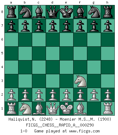 Last move : 1-0 2023 January 26 4:51:19 [Event "FICGS__CHESS__RAPID_A__000290"] [Site "FICGS"] [Date "2022.12.09"] [Round "1"] [White "Hallqvist,Niklas"] [Black "Moenier M.S.,Misbchoel"] [Result "1-0"] [WhiteElo "2248"] [BlackElo "1900"] 1.Nf3 1-0 This chess game has been lost on time (started : 2022.12.09 13:35:49) Follow this game move after move (download)Play the opening like a book, the middle game like a magician, and the endgame like a machine. (Spielmann) Ich hatte Zahnschmerzen im ersten Spiel. In der zweiten Partie tat mir der Kopf weh. In der dritten war es eine Rheuma-Attacke und während der vierten fühlte ich mich nicht gut. Und in der fünften? Nun, man muss doch nicht jedes Spiel gewinnen, oder? (Savielly Grigorievitsch Tartakower) Me siento como si fuera una pieza en una partida de Ajedrez, cuando mi oponente me indica: esa pieza no puede ser movida. (Soren Kierkegaard) Mon pion favori sur ma case favorite ! Bronstein en parlant d'un coup de pion en h5 quand il avait les Noirs. Internet: Absolute communication, absolute isolation. (Paul Carvel)