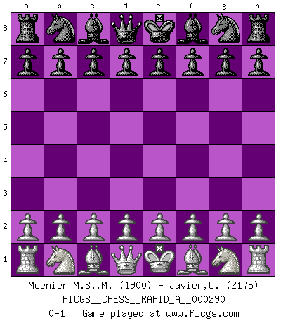 Last move : 0-1 2023 January 8 21:47:36 [Event "FICGS__CHESS__RAPID_A__000290"] [Site "FICGS"] [Date "2022.12.09"] [Round "1"] [White "Moenier M.S.,Misbchoel"] [Black "Javier,Christian"] [Result "0-1"] [WhiteElo "1900"] [BlackElo "2175"] 0-1 This chess game has been lost on time (started : 2022.12.09 13:35:49) Follow this game move after move (download)Chess mastery essentially consists of analyzing Chess positions accurately. (Mikhail Botvinnik) Ich war zu klein für die Schach-Schülermannschaft! (Woody Allen) El estómago es una parte esencial del maestro de Ajedrez. (Bent Larsen) L'attaque fait le spectacle, la défense gagne les matchs. (Dicton footballistique) Luck is the residue of design. (John Milton)
