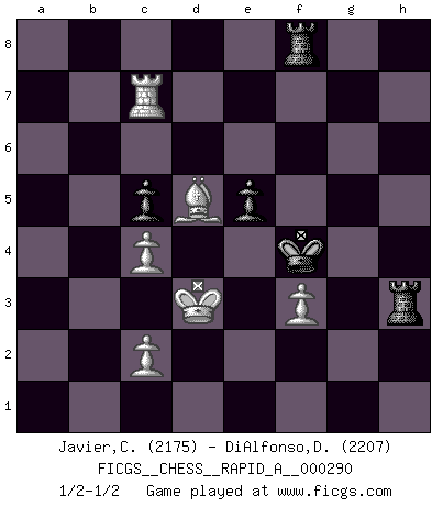 Last move : 1/2-1/2 2023 March 16 14:51:30 [Event "FICGS__CHESS__RAPID_A__000290"] [Site "FICGS"] [Date "2022.12.09"] [Round "1"] [White "Javier,Christian"] [Black "DiAlfonso,Darren"] [Result "1/2-1/2"] [WhiteElo "2175"] [BlackElo "2207"] 1.e4 e5 2.Nf3 Nc6 3.Bb5 Nf6 4.Nc3 Nd4 5.Nxd4 exd4 6.e5 dxc3 7.exf6 Qxf6 8.dxc3 Bc5 9.Qe2+ Qe6 10.Qxe6+ fxe6 11.f3 a5 12.a4 e5 13.Bd2 c6 14.Bd3 d6 15.h4 Be6 16.h5 Kd7 17.Rb1 Kc7 18.Ke2 Rae8 19.Be1 Ba2 20.Ra1 Be6 21.Rb1 g5 22.b4 Bb6 23.Bf2 Bxf2 24.Kxf2 axb4 25.Rxb4 c5 26.Rb2 Ra8 27.Rhb1 Bd5 28.Ra1 b6 29.c4 Bc6 30.Rab1 Rxa4 31.h6 g4 32.Rxb6 gxf3 33.gxf3 Rf8 34.Rxc6+ Kxc6 35.Be4+ Kd7 36.Rb7+ Ke6 37.Bd5+ Kf6 38.Rxh7 Kg6 39.Rd7 Kxh6 40.Rxd6+ Kg5 41.Re6 Kf5 42.Rc6 Kf4 43.Rh6 Ra1 44.Rh5 Rd8 45.Rh7 Rf8 46.Rg7 Rh1 47.Ke2 Rh2+ 48.Kd3 Rh1 49.Rc7 Rh3 50.Ke2 Rh2+ 51.Kd3 Rh3 1/2-1/2 Follow this game move after move (download)It was clear to me that the vulnerable point of the American Grandmaster (Bobby Fischer) was in double-edged, hanging, irrational positions, where he often failed to find a win even in a won position. (Efim Geller) Es ist wirklich schade, dass so viele Schachspieler nicht auf ihr Äußeres achten! (Alexandra Kosteniuk) Si un gobernante no entiende al Ajedrez, ¿como puede governar él un reinado?. (El Rey Khusros II) Les échecs c'est le défi de l'alpiniste, toujours plus haut, prêt à tout pour monter à l'assaut du Roi ennemi. Les échecs, c'est de la musique en mouvement, un ballet majestueux pour les yeux. C'est de la poésie composée par les fantômes du passé qui au même titre que Rimbaud ou Verlaine méritent notre admiration. Les échecs, c'est de la peinture ou le moindre mouvement modifie le tableau pour en faire un Picasso ou un Van Gogh. Les échecs, c'est tout et rien, c'est la vie et la mort. Jjulie33 sur le forum de France-Echecs. Treat your password like your toothbrush. Don't let anybody else use it, and get a new one every six months. (Clifford Stoll)