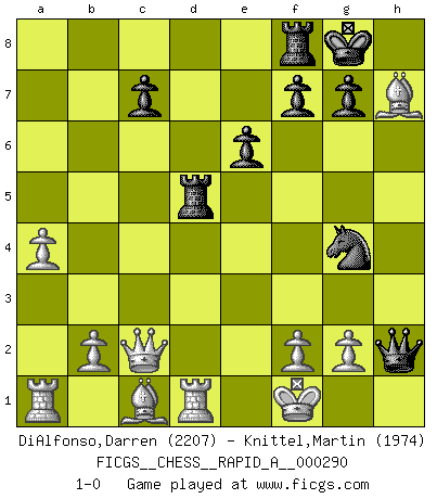 Last move : 1-0 2023 February 17 19:56:31 [Event "FICGS__CHESS__RAPID_A__000290"] [Site "FICGS"] [Date "2022.12.09"] [Round "1"] [White "DiAlfonso,Darren"] [Black "Knittel,Martin"] [Result "1-0"] [WhiteElo "2207"] [BlackElo "1974"] 1.d4 Nf6 2.c4 e6 3.Nf3 d5 4.Nc3 dxc4 5.e4 Bb4 6.Bxc4 Nxe4 7.O-O Nf6 8.Qa4+ Nc6 9.Ne5 Rb8 10.Rd1 O-O 11.Nxc6 bxc6 12.Qxa7 Bd7 13.Qa4 c5 14.Qc2 cxd4 15.Rxd4 Qe7 16.a4 Bc5 17.Rd1 Ng4 18.Ne4 Bc6 19.Nxc5 Qxc5 20.Bd3 Qe5 21.Qxc6 Rbd8 22.Qc2 Qxh2+ 23.Kf1 Rd5 24.Bxh7+ 1-0 This chess game has been lost on time (started : 2022.12.09 13:35:49) Follow this game move after move (download)Every Pawn is a potential Queen. (James Mason) Schach ist Kampf, hauptsächlich jedoch gegen die eigenen Fehler. (Savielly Grigorievitsch Tartakower) Es el objetivo de la escuela moderna no tratar cada posición de acuerdo a una regla general, sino de acuerdo al principio inherente en la posición. (Richard Reti) C'est la seule position que je connaisse où les deux camps sont mals. Propos prêtés à V. Anand. History is the quarrels of popes and kings, with wars or pestilences in every page; the men all so good for nothing, and hardly any women at all. (Jane Austen)