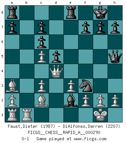 Last move : 0-1 2023 January 3 10:32:8 [Event "FICGS__CHESS__RAPID_A__000290"] [Site "FICGS"] [Date "2022.12.09"] [Round "1"] [White "Faust,Dieter"] [Black "DiAlfonso,Darren"] [Result "0-1"] [WhiteElo "1987"] [BlackElo "2207"] 1.c4 e5 2.Nc3 Nf6 3.Nf3 Nc6 4.d4 exd4 5.Nxd4 Bb4 6.Nxc6 Bxc3+ 7.bxc3 bxc6 8.Ba3 d6 9.c5 d5 10.e3 O-O 11.Qd4 Re8 12.Bd3 Nd7 13.O-O Ne5 14.Bc2 Ba6 15.Rfe1 Qg5 16.Kh1 Qh5 17.Kg1 Be2 18.Reb1 Nf3+ 0-1 Follow this game move after move (download)Examine moves that smite! A good eye for smites is far more important than a knowledge of strategical principles. (Purdy) In Buenos Aires ist es nicht mein vorrangiges Ziel ein starkes Turnier zu organisieren, sondern ein Turnier für Gentlemen. Ich würde nie Kamsky einladen. Ich mag keine Probleme. (Miguel Najdorf) Las piezas de Ajedrez son los bloques del alfabeto que moldean los pensamientos; y esos pensamientos, aunque hagan un diseño visual en el tablero, expresan abstractamente su belleza como un poema. (Marcel Duchamp) La tactique, c'est ce que vous faites quand il y a quelque chose à faire; la stratégie, c'est ce que vous faites quand il n'y a rien à faire. (Savielli Tartacower) I believe in luck. How else can you explain the success of those you dislike ? (Jean Cocteau)