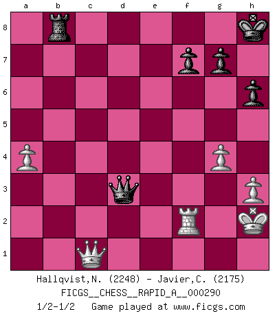 Last move : 1/2-1/2 2023 March 18 10:51:2 [Event "FICGS__CHESS__RAPID_A__000290"] [Site "FICGS"] [Date "2022.12.09"] [Round "1"] [White "Hallqvist,Niklas"] [Black "Javier,Christian"] [Result "1/2-1/2"] [WhiteElo "2248"] [BlackElo "2175"] 1.c4 e5 2.g3 Nf6 3.Bg2 c6 4.Nf3 e4 5.Nd4 Qb6 6.Nb3 a5 7.d3 a4 8.N3d2 Bc5 9.O-O e3 10.fxe3 Bxe3+ 11.Kh1 Ng4 12.Ne4 O-O 13.Nbc3 Bxc1 14.Qxc1 d5 15.cxd5 Ne3 16.Rf3 Nxd5 17.Qd2 Qd8 18.Rf2 a3 19.Nxd5 cxd5 20.Nc3 Be6 21.bxa3 Rxa3 22.Qb2 Ra6 23.Qxb7 Rb6 24.Qa7 Nc6 25.Qa4 h6 26.Raf1 Qd7 27.Qf4 Rb4 28.Qd2 Rfb8 29.Rf4 Rb2 30.Qc1 Ne5 31.Rd4 Kh8 32.a4 Qa7 33.Rdf4 Qa5 34.h3 Qb6 35.Nxd5 Bxd5 36.Bxd5 Rxe2 37.Be4 Qe6 38.g4 Qd7 39.R1f2 Nxd3 40.Bxd3 Rxf2 41.Rxf2 Qxd3 42.Kh2 1/2-1/2 Follow this game move after move (download)My God, Bobby Fischer plays so simply. (Alexei Suetin) Offensichtlich kennt Kasparow nichts anderes als Schach, und ich könnte 500 weitere Spieler dieser Sorte benennen. (Judith Polgar) Los asuntos humanos son como una partida de Ajedrez: solo aquellos que no lo toman seriamente, pueden ser llamados buenos jugadores. (Hung Tzu Ch'eng) Les sacrifices démontrent seulement que quelqu'un a gaffé. (Savielly Tartacover) Once you start thinking you have nothing left to learn, you have everything to learn. (Steve Badget)