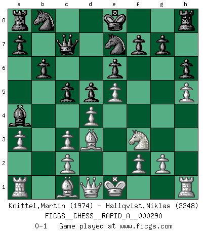 Last move : 0-1 2023 February 20 23:38:2 [Event "FICGS__CHESS__RAPID_A__000290"] [Site "FICGS"] [Date "2022.12.09"] [Round "1"] [White "Knittel,Martin"] [Black "Hallqvist,Niklas"] [Result "0-1"] [WhiteElo "1974"] [BlackElo "2248"] 1.e4 e6 2.d4 d5 3.Nc3 Bb4 4.e5 c5 5.a3 Bxc3+ 6.bxc3 Ne7 7.h4 Qc7 8.h5 h6 9.Nf3 b6 10.Bb5+ Bd7 11.Bd3 Ba4 0-1 This chess game has been lost on time (started : 2022.12.09 13:35:49) Follow this game move after move (download)Your body has to be in top condition. Your Chess deteriorates as your body does. You can't separate body from mind. (Bobby Fischer) Verschiedene, sehr schätzbare und im Laufe des Lebens nützliche Eigenschaften des Geistes können durch das Schachspiel erworben und gekräftigt werden, so dass sie zu Gewohnheiten werden, die uns nie im Stich lassen. (Benjamin Franklin) Nos gusta pensar. (Gary Kasparov) On n'a jamais que l'âge auquel on a commence à jouer aux échecs car après on cesse de vieillir. (Capablanca) I find television to be very educating. Every time somebody turns on the set, I go in the other room and read a book. (Groucho Marx)