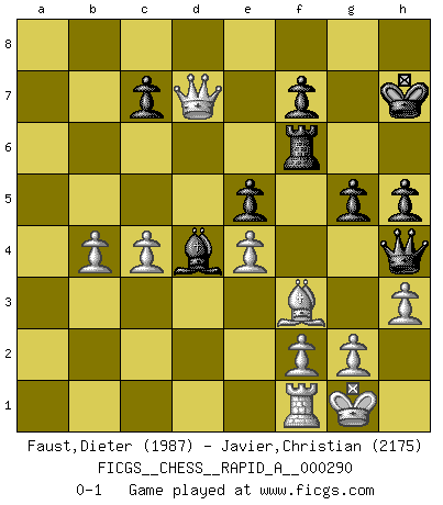 Last move : 0-1 2023 February 16 12:19:13 [Event "FICGS__CHESS__RAPID_A__000290"] [Site "FICGS"] [Date "2022.12.09"] [Round "1"] [White "Faust,Dieter"] [Black "Javier,Christian"] [Result "0-1"] [WhiteElo "1987"] [BlackElo "2175"] 1.c4 e5 2.Nc3 Nf6 3.Nf3 Nc6 4.a3 d5 5.cxd5 Nxd5 6.Qc2 Nxc3 7.dxc3 Qf6 8.e4 Bc5 9.b4 Bb6 10.Be2 O-O 11.O-O a5 12.Bb2 Bg4 13.h3 Bxf3 14.Bxf3 Nd8 15.Rad1 axb4 16.axb4 Ne6 17.Bc1 Nf4 18.Bxf4 Qxf4 19.Qd2 Qf6 20.Qb2 g6 21.Rd5 Kg7 22.Ra1 Qh4 23.Rxa8 Rxa8 24.Rd7 Kf8 25.Bg4 h5 26.Bf3 Ra6 27.Rd1 Kg7 28.Qc2 g5 29.Qe2 Kg6 30.Rf1 Ba7 31.Qb5 Re6 32.Qxb7 Bb6 33.Qa8 Kg7 34.Qd8 Rd6 35.Qe7 Re6 36.Qd8 Rf6 37.Qd7 Kh7 38.c4 Bd4 0-1 Follow this game move after move (download)All I want to do, ever, is just play Chess. (Bobby Fischer) Ich habe die Schachforschung dermaßen betrieben, dass sie auf eine wissenschaftliche Basis gestellt wurde. (Mikhail Moiseyevich Botvinik) El Ajedrez es un cuento de Hadas de las 1001 metidas de pata. (Savielly Tartakower) La menace est plus forte que l'exécution. (Aaron Nimzovitch) In God we trust, all others we virus scan. (Anonymous)