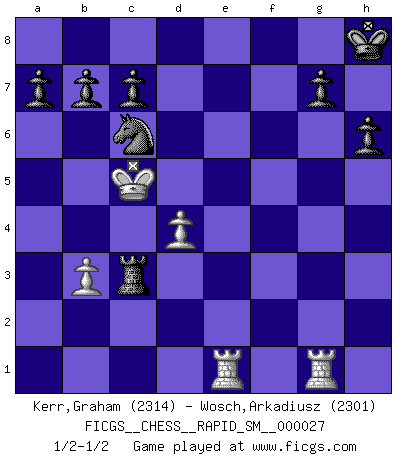 Last move : 1/2-1/2 2023 April 15 14:39:6 [Event "FICGS__CHESS__RAPID_SM__000027"] [Site "FICGS"] [Date "2022.12.12"] [Round "1"] [White "Kerr,Graham"] [Black "Wosch,Arkadiusz"] [Result "1/2-1/2"] [WhiteElo "2314"] [BlackElo "2301"] 1.d4 d5 2.Nf3 Nc6 3.c4 Bg4 4.cxd5 Bxf3 5.gxf3 Qxd5 6.e3 e5 7.Nc3 Bb4 8.Bd2 Bxc3 9.bxc3 exd4 10.cxd4 Nge7 11.Rg1 O-O 12.Qb3 Qxf3 13.Rb1 Rfe8 14.Be2 Qh3 15.Bc4 Qxh2 16.Bxf7+ Kh8 17.Rg5 Rf8 18.Ke2 Rad8 19.Rbg1 Nf5 20.Bc3 Nxe3 21.Kxe3 Rde8+ 22.Bxe8 Qxf2+ 23.Kd3 Rf3+ 24.Kc4 Qe2+ 25.Kc5 Qe7+ 26.Kd5 Qxe8 27.Re1 Qf7+ 28.Kc5 Qxb3 29.axb3 h6 30.R5g1 Rxc3+ 1/2-1/2 Follow this game move after move (download)Some sacrifices are sound; the rest are mine. (Mikhail Tal) Ein Kibitz ist einer, der deinem Gegner gute Ratschläge gibt. (Andrew Soltis) Aquellos que dicen que entienden al Ajedrez, no entienden nada. (Robert Hubner) Nous vivons dans un monde échiquéen : chaque jour qui passe est un défi à relever. (Philosophe Sasha) Ah, the Socrating method. The best way we have of teaching everything-apart from juggling chainsaws. (Gregory House, House M.D.)