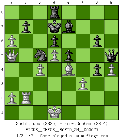Last move : 1/2-1/2 2023 April 11 10:7:48 [Event "FICGS__CHESS__RAPID_SM__000027"] [Site "FICGS"] [Date "2022.12.12"] [Round "1"] [White "Sorbi,Luca"] [Black "Kerr,Graham"] [Result "1/2-1/2"] [WhiteElo "2320"] [BlackElo "2314"] 1.e4 c5 2.Nf3 d6 3.d4 cxd4 4.Nxd4 Nf6 5.Nc3 a6 6.f3 e5 7.Nb3 Be6 8.Be3 h5 9.Nd5 Bxd5 10.exd5 Nbd7 11.Qd2 Qc7 12.O-O-O Be7 13.c4 a5 14.Kb1 O-O 15.Na1 a4 16.Nc2 a3 17.Nxa3 Rxa3 18.bxa3 Ra8 19.Qc3 Bf8 20.Rd2 Nc5 21.Bd3 g6 22.Bc2 Bg7 23.Kc1 Nfd7 24.Kd1 Qd8 25.Re1 Qh4 26.h3 Bf6 27.Bf2 Qf4 28.g3 Qh6 29.Rde2 Qg7 30.Qb4 Bd8 31.Qb2 h4 32.gxh4 Qh6 33.Rg1 Bxh4 34.Be3 Qh5 35.Rg4 Bf6 36.Bxc5 Nxc5 37.h4 Kf8 38.Reg2 Ke8 39.a4 Kd7 40.Qb5+ Kc7 41.a5 Rd8 42.Be4 Be7 43.Rb2 f5 44.a6 fxg4 45.Qa5+ Kd7 46.Qb5+ Kc7 47.Qa5+ Kd7 1/2-1/2 Follow this game move after move (download)Chess, like any creative activity, can exist only through the combined efforts of those who have creative talent, and those who have the ability to organize their creative work. (Mikhail Botvinnik) Bis jetzt ist Weiß einer wohlbekannten Analyse gefolgt. Aber jetzt begeht er einen schrecklichen Fehler: Er beginnt seinen eigenen Kopf zu benutzen. (Siegbert Tarrasch) Ser exitoso en el Ajedrez te permite descubrir tu propia personalidad. Eso es lo que deseo para los niños de mi clase. (Saudin Robovic) Les échecs sont utiles à l'exercice de la faculté de penser et à celle de l'imagination. Car nous devons posséder une méthode élaborée pour atteindre des buts partout où nous devons conduire notre raison. (Leibnitz) Big Chess is a place for big hallucinations. (Thibault de Vassal)