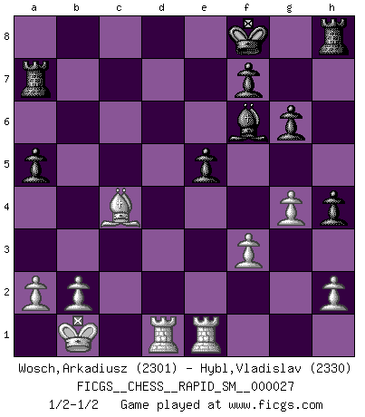 Last move : 1/2-1/2 2023 May 5 23:45:37 [Event "FICGS__CHESS__RAPID_SM__000027"] [Site "FICGS"] [Date "2022.12.12"] [Round "1"] [White "Wosch,Arkadiusz"] [Black "Hybl,Vladislav"] [Result "1/2-1/2"] [WhiteElo "2301"] [BlackElo "2330"] 1.e4 c5 2.Nf3 d6 3.d4 cxd4 4.Nxd4 Nf6 5.Nc3 a6 6.Be3 e5 7.Nb3 Be6 8.f3 h5 9.Qd2 Nbd7 10.Nd5 Bxd5 11.exd5 g6 12.O-O-O Nb6 13.Kb1 Nbxd5 14.Bg5 Be7 15.g3 Nb6 16.Bxf6 Bxf6 17.Qxd6 h4 18.g4 Na4 19.Bc4 Qxd6 20.Rxd6 Be7 21.R6d1 Kf8 22.Bd5 Ra7 23.Nc1 Nc5 24.Rhe1 Bf6 25.Nb3 Nxb3 26.Bxb3 b5 27.c4 bxc4 28.Bxc4 a5 1/2-1/2 Follow this game move after move (download)There are tough players and nice guys, and I'm a tough player. (Bobby Fischer) Nicht daß Diemer aus Opportunismus Mitglied der NSDAP geworden wäre. Er war ein Fanatiker, in allem, was er tat. (Hans Ree) La mitad de las variaciones que son calculadas en una partida de torneo, resultan ser completamente superfluas. Desafortunadamente, nadie sabe por adelantado cual mitad. (Jan Tinman) Les échecs, c'est la lutte contre l'erreur. (Johannes Zukertort) Life is painting a picture, not doing a sum. (Oliver Wendell Holmes, Jr.)