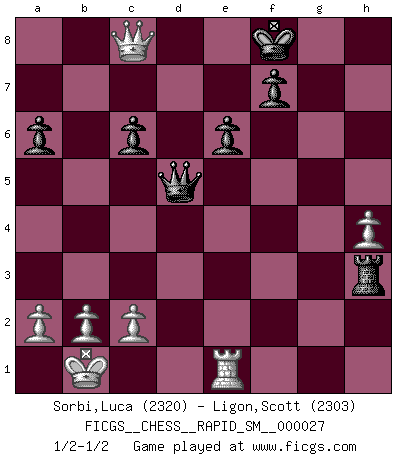 Last move : 1/2-1/2 2023 February 16 19:45:3 [Event "FICGS__CHESS__RAPID_SM__000027"] [Site "FICGS"] [Date "2022.12.12"] [Round "1"] [White "Sorbi,Luca"] [Black "Ligon,Scott"] [Result "1/2-1/2"] [WhiteElo "2320"] [BlackElo "2303"] 1.e4 d5 2.exd5 Nf6 3.Nf3 Qxd5 4.Nc3 Qa5 5.d4 Bf5 6.Bd2 e6 7.Ne5 Qb6 8.Qf3 c6 9.O-O-O Nbd7 10.Bd3 Bxd3 11.Qxd3 Rd8 12.Qg3 Qxd4 13.Nxd7 Qxd7 14.Rhe1 Rg8 15.Bg5 Bd6 16.Qe3 Qc7 17.Ne4 Be7 18.Rxd8+ Qxd8 19.Rd1 Qc8 20.Bxf6 gxf6 21.g3 f5 22.Nc5 Bxc5 23.Qxc5 a6 24.Qd4 Qc7 25.Qh4 Rh8 26.Kb1 Qe7 27.Qf4 Kf8 28.Qh6+ Ke8 29.Qg7 Rf8 30.Qxh7 Qf6 31.Qh3 Rh8 32.Qg2 Qe5 33.h4 Qe2 34.Qg1 Rg8 35.Re1 Qh5 36.Qf1 f4 37.Qd3 fxg3 38.fxg3 Qd5 39.Qc3 Rg4 40.Qf6 Rxg3 41.Qf4 Rh3 42.Qb8+ Ke7 43.Qxb7+ Kf8 44.Qc8+ 1/2-1/2 Follow this game move after move (download)The older I grow, the more I value pawns. (Paul Keres) Rauchen ist dem Schachspieler bei seiner Arbeit, also im Wettkampf, untersagt. (Viktor Kortschnoi) Ciertamente el estado mental actual de Bobby Fischer es una tragedia. Uno de los mas grandes jugadores de Ajedrez del mundo -el orgullo y pena del Ajedrez Americano. (Frank Brady) Un millionnaire : 'Monsieur Steinitz ! Vous ne participez aux tournois que pour l'argent, alors que moi je n'y viens que pour l'honneur.' Steinitz : 'Chacun joue pour ce qu'il n'a pas'... Have no fear of perfection - you'll never reach it. (Salvador Dali)