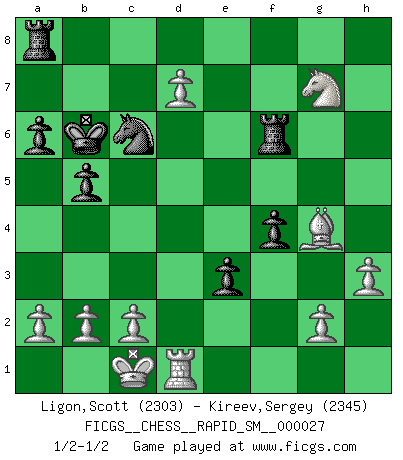 Last move : 1/2-1/2 2023 January 18 9:23:35 [Event "FICGS__CHESS__RAPID_SM__000027"] [Site "FICGS"] [Date "2022.12.12"] [Round "1"] [White "Ligon,Scott"] [Black "Kireev,Sergey"] [Result "1/2-1/2"] [WhiteElo "2303"] [BlackElo "2345"] 1.e4 g6 2.d4 Bg7 3.Nc3 d6 4.Be3 Nf6 5.Qd2 a6 6.O-O-O Ng4 7.Bg5 c5 8.Nd5 f6 9.Bf4 cxd4 10.h3 Ne5 11.Qxd4 Nbc6 12.Qd2 e6 13.Ne3 b5 14.Qxd6 Qxd6 15.Rxd6 g5 16.Bh2 Bf8 17.Rd2 h5 18.Be2 Bc5 19.Nf3 Ke7 20.Rhd1 Nf7 21.Kb1 Bxe3 22.fxe3 e5 23.Bg3 Be6 24.Be1 h4 25.Nh2 Rhb8 26.Rd5 Bxd5 27.exd5 Ncd8 28.Bb4+ Nd6 29.Bxd6+ Kxd6 30.Ng4 f5 31.Nh6 f4 32.Nf5+ Kc5 33.d6 e4 34.d7 Rb6 35.Bg4 Rf6 36.Rd4 Re6 37.exf4 e3 38.Rd1 gxf4 39.Nxh4 Rf6 40.Nf5 Nc6 41.Ng7 Kb6 42.Kc1 1/2-1/2 Follow this game move after move (download)The chessboard is the world, the pieces are the phenomena of the Universe, the rules of the game are what we call the laws of Nature and the player on the other side is hidden from us. (Thomas Huxley) Sehr viele beherrschen heutzutage das große Einmalseins des Schachspiels und kennen sogar dessen Logarithmentafeln auswendig - deshalb sollte man hin und wieder zu beweisen trachten, dass zwei mal zwei auch fünf sein kann. (Mikhail Nekhemyevich Tal) Ser exitoso en el Ajedrez te permite descubrir tu propia personalidad. Eso es lo que deseo para los niños de mi clase. (Saudin Robovic) Le joueur d'Echecs qui veut atteindre le top est obligé de développer son propre credo créatif. Alexeï Stepanovicth Souétine. Il est facile d'écrire des livres ! Ce qui est difficile, c'est de jouer ! (Alexeï Stepanovicth Souétine) The only difference between a tax man and a taxidermist is that the taxidermist leaves the skin. (Mark Twain)