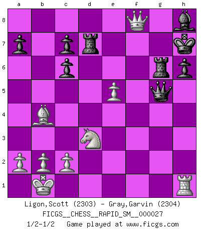 Last move : 1/2-1/2 2023 January 19 15:9:37 [Event "FICGS__CHESS__RAPID_SM__000027"] [Site "FICGS"] [Date "2022.12.12"] [Round "1"] [White "Ligon,Scott"] [Black "Gray,Garvin"] [Result "1/2-1/2"] [WhiteElo "2303"] [BlackElo "2304"] 1.e4 e5 2.f4 exf4 3.Bc4 Nc6 4.Nf3 g5 5.d4 Bg7 6.h4 h6 7.Nc3 d6 8.Qd3 Bg4 9.Bb5 Kf8 10.Bxc6 bxc6 11.Bd2 Ne7 12.O-O-O Ng6 13.Ne2 Bxf3 14.Qxf3 Nxh4 15.Rxh4 gxh4 16.Nxf4 Qf6 17.Kb1 Kg8 18.Bc3 Rb8 19.g3 hxg3 20.Qxg3 Kh7 21.Nh5 Qg6 22.Qh2 Rhg8 23.Rh1 Bh8 24.Nf4 Qf6 25.e5 dxe5 26.dxe5 Qg5 27.Nd3 Rg6 28.Qf2 Rf8 29.Bb4 Rfg8 30.Qxf7+ R8g7 31.Qf8 Rd7 1/2-1/2 Follow this game move after move (download)Blessed be the memory of him who gave the world this immortal game. (A. G. Gardiner) Die FIDE ist dabei in die Hände der russischen Mafia zu fallen. (Larry Evans) Los tropiezos estan todos ahí en el tablero, esperando que se cometan. (Savielly Tartakover) Les ravages du H expliquent la différence de niveau entre Tal et Thal [Abergel]. I take risks, sometimes patients die, but not taking risks causes more patients to die. So I guess my biggest problem is I've been cursed with the ability to do the math. (Gregory House, House M.D.)