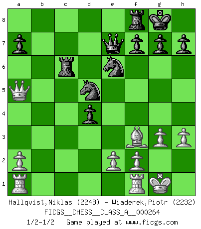 Last move : 1/2-1/2 2023 March 2 8:16:13 [Event "FICGS__CHESS__CLASS_A__000264"] [Site "FICGS"] [Date "2022.12.13"] [Round "1"] [White "Hallqvist,Niklas"] [Black "Wiaderek,Piotr"] [Result "1/2-1/2"] [WhiteElo "2248"] [BlackElo "2232"] 1.Nf3 d5 2.g3 Bg4 3.Bg2 c6 4.O-O Nf6 5.h3 Bxf3 6.Bxf3 e5 7.d4 Nbd7 8.c4 dxc4 9.Nd2 exd4 10.Nxc4 Nc5 11.b4 Ne6 12.Qb3 Be7 13.b5 Nc5 14.Qb4 O-O 15.bxc6 bxc6 16.Ba3 Nd5 17.Qa5 Ne6 18.Bxe7 Qxe7 19.Ne5 Rac8 20.Nxc6 Rxc6 1/2-1/2 Follow this game move after move (download)Chess is a forcing house where the fruits of character can ripen more fully than in life. (Edward Morgan Foster) Im Fernschach kannst du während dem Spiel rauchen. (John Christen Knudsen) La partida mas dura de ganar es una partida ganada. (Emanuel Lasker) Les réformistes prétendent que les progrès de la théorie conduiront à la disparition des échecs, et qu'il faut, pour leur rendre vie, en remanier les règles. En réalité, qu'exprime cette affirmation? Le mépris de l'intuition, de l'imagination et de tous les autres éléments qui font des échecs un art. (Alexander Alekhine) No, no, you're not thinking; you're just being logical. (Niels Bohr)