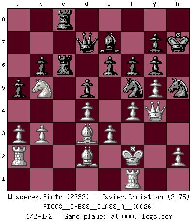 Last move : 1/2-1/2 2023 March 21 3:51:18 [Event "FICGS__CHESS__CLASS_A__000264"] [Site "FICGS"] [Date "2022.12.13"] [Round "1"] [White "Wiaderek,Piotr"] [Black "Javier,Christian"] [Result "1/2-1/2"] [WhiteElo "2232"] [BlackElo "2175"] 1.d4 d5 2.c4 c6 3.Nf3 Nf6 4.e3 Bf5 5.Nc3 e6 6.Nh4 Bg6 7.Bd2 Be7 8.Nxg6 hxg6 9.Bd3 O-O 10.cxd5 cxd5 11.g4 Nc6 12.f4 Na5 13.g5 Nh5 14.b3 Nc6 15.a3 Bd6 16.O-O Ne7 17.Rf3 Nf5 18.Nb5 a5 19.Rc1 Qd7 20.Qe1 b6 21.Rf1 Rac8 22.Rd1 Be7 23.Qe2 Rc6 24.Kg2 Rfc8 25.Kg1 Rf8 26.Qf3 Rfc8 27.Rf2 Rb8 28.Qe2 Re8 29.Ra1 Rd8 30.Qf3 Rb8 31.Qe2 Rf8 32.Qg4 Ra8 33.Qe2 Rf8 34.Qg4 Re8 35.Qf3 Rb8 36.R2f1 Rbc8 37.Ra2 Kh7 38.Kf2 f6 39.Qg4 1/2-1/2 Follow this game move after move (download)I don't believe in psychology. I believe in good moves. (Bobby Fischer) Stil? Ich habe keinen Stil! (Anatoly Karpov) El Ajedrez es parte de una cultura y si una cultura esta en decadencia, entonces también el Ajedrez declinará. (Mikhail Botvinnik) La tactique est l'élément le plus important du milieu de jeu. (Siegbert Tarrasch) Players are not good because they find tactics, it is about the way to find the positions in which those tactics are hidden. (Luc-Olivier Leclerc)