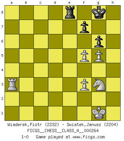 Last move : 1-0 2023 May 7 10:22:55 [Event "FICGS__CHESS__CLASS_A__000264"] [Site "FICGS"] [Date "2022.12.13"] [Round "1"] [White "Wiaderek,Piotr"] [Black "Swiatek,Janusz"] [Result "1-0"] [WhiteElo "2232"] [BlackElo "2204"] 1.d4 Nf6 2.c4 g6 3.f3 c5 4.d5 d6 5.e4 Bg7 6.Bd3 e6 7.Ne2 exd5 8.cxd5 Nfd7 9.Nbc3 Ne5 10.Bc2 Qh4+ 11.Ng3 O-O 12.O-O Bd7 13.Nce2 Na6 14.a3 c4 15.Be3 Nc5 16.Qc1 Ncd3 17.Bxd3 Nxd3 18.Qxc4 Nxb2 19.Qa2 Rfc8 20.Rab1 Nc4 21.Bf2 Qd8 22.Rxb7 h5 23.h4 Be8 24.Rfb1 Qa5 25.Bd4 Bxd4+ 26.Nxd4 Nxa3 27.R7b4 a6 28.f4 Rc3 29.Rb8 Rc8 30.R8b4 Nc4 31.Qf2 Bd7 32.f5 Ne5 33.Qf4 Qd8 34.Nf3 Nd3 35.Qh6 Qf8 36.Qg5 Qd8 37.Rb7 Qxg5 38.hxg5 Be8 39.e5 Nc5 40.Re7 dxe5 41.d6 h4 42.Nxh4 a5 43.Rf1 Rcb8 44.Nf3 Rb3 45.Rc1 a4 46.Rxc5 a3 47.Rxe8+ Rxe8 48.Ra5 R3b8 49.Rxa3 e4 50.d7 exf3 51.dxe8Q+ Rxe8 52.gxf3 1-0 Follow this game move after move (download)Chess is not like life... it has rules ! (Mark Pasternak) Ich habe die Schachforschung dermaßen betrieben, dass sie auf eine wissenschaftliche Basis gestellt wurde. (Mikhail Moiseyevich Botvinik) Cuando me preguntan: -¿Cual es el secreto que te hace hacer mejores movidas que tus oponentes?, Yo respondo: Me da gusto que me pregunten eso, porque, como veran, hay una simple razón. Yo pienso mis propias movidas y dejo a mi oponente que el piense las suyas. (Alexander Alekhine) La solitude du joueur d'Echecs à l'approche du mat est semblable à celle du condamné. (Francis Szpiner) For to win one hundred victories in one hundred battles is not the acme of skill. To subdue the enemy without fighting is the acme of skill. (Sun Tzu)