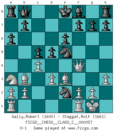 Last move : 0-1 2007 August 29 19:52:24 [Event "FICGS__CHESS__CLASS_C__000057"] [Site "FICGS"] [Date "2007.08.18"] [Round "1"] [White "Gally,Robert"] [Black "Staggat,Rolf"] [Result "0-1"] [WhiteElo "1600"] [BlackElo "1661"] 1.e4 c5 2.Bc4 Nc6 3.Nf3 d6 4.d3 Nf6 5.Bd2 Bg4 6.Na3 a6 7.Bb3 e6 8.h3 Bxf3 9.Qxf3 Nd4 10.Qf4 d5 11.e5 Nd7 12.c4 Qb8 13.Be3 Nxe5 14.O-O Ne2+ 0-1 Sicilian defense Kingside Castling by player White (move 14) Player Black won this chess game. Follow this game move after move (download)Who is your opponent tonight, tonight I am playing against the Black pieces. (Akiba Rubinstein) Der Partner hat auch seine Existenzberechtigung. (Savielly Grigorievitsch Tartakower) Juega la Apertura como un libro, el Juego Medio como un mago y los Finales como una máquina. (Spielmann) Le jeu d'échecs fait naître et fortifie en nous plusieurs qualités précieuses dans le cours de l'existence, telles que la prévoyance, la circonspection, la prudence, et la persévérance. (Benjamin Franklin - 1783, la morale des échecs) Excelling at chess has long been considered a symbol of more general intelligence. That is an incorrect assumption in my view, as pleasant as it might be. But for the purposes of argument and investigation, chess is, in Russkin-Gutman's words, 'an unparalleled laboratory, since both the learning process and the degree of ability obtained can be objectified and quantified, providing an excellent comparative framework on which to use rigorous analytical techniques.' (The Chess Master and the Computer, by Garry Kasparov - 2010)