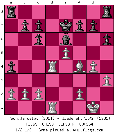 Last move : 1/2-1/2 2023 May 9 21:33:33 [Event "FICGS__CHESS__CLASS_A__000264"] [Site "FICGS"] [Date "2022.12.13"] [Round "1"] [White "Pech,Jaroslav"] [Black "Wiaderek,Piotr"] [Result "1/2-1/2"] [WhiteElo "2021"] [BlackElo "2232"] 1.e4 e5 2.Nf3 Nc6 3.Bb5 Nf6 4.O-O Nxe4 5.d4 Nd6 6.Bxc6 dxc6 7.dxe5 Nf5 8.Qxd8+ Kxd8 9.Rd1+ Ke8 10.Nc3 Ne7 11.h3 Ng6 12.Be3 Bb4 13.Ne2 a5 14.Nf4 Nxf4 15.Bxf4 a4 16.Nd4 Bc5 17.Rd2 Bxd4 18.Rxd4 h6 19.Rad1 Ke7 20.g4 Be6 1/2-1/2 Follow this game move after move (download)You have to have the fighting spirit. You have to force moves and take chances. (Bobby Fischer) Der vorletzte Fehler gewinnt. (Savielly Grigorievitsch Tartakower) No soy una persona materialista y por eso, no resiento la falta o pérdida del dinero. La ausencia de cosas mundanas carece de importancia. Ya que el Ajedrez es una forma en la que puedo ser tan materialista como yo desee sin tener la necesidad de vender mi alma. (Jamie Walter Adams) Ce qui est bien, c'est d'avoir tout un tas de pièces en prise : l'adversaire ne peut en prendre qu'une à la fois. Cité par Thierry Audin. I have opinions of my own - strong opinions - but I don't always agree with them. (George Bush)