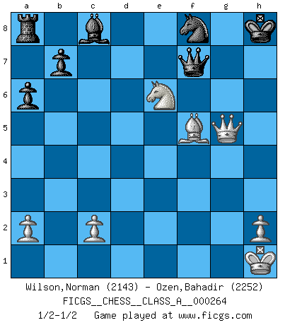 Last move : 1/2-1/2 2023 January 9 9:37:9 [Event "FICGS__CHESS__CLASS_A__000264"] [Site "FICGS"] [Date "2022.12.13"] [Round "1"] [White "Wilson,Norman"] [Black "Ozen,Bahadir"] [Result "1/2-1/2"] [WhiteElo "2143"] [BlackElo "2252"] 1.e4 c5 2.Nf3 d6 3.d4 cxd4 4.Nxd4 Nf6 5.Nc3 a6 6.Bg5 e6 7.f4 Qb6 8.Qd3 Qxb2 9.Rb1 Qa3 10.f5 Be7 11.fxe6 fxe6 12.Be2 Qa5 13.Bd2 Qc7 14.g4 h6 15.Qh3 O-O 16.g5 hxg5 17.Nxe6 Qc6 18.O-O d5 19.exd5 Nxd5 20.Nxd5 Qxd5 21.Rxf8+ Bxf8 22.Bg4 Qxd2 23.Rd1 Qb4 24.Bf5 g6 25.Bxg6 Qe7 26.Bf5 Nc6 27.Kh1 Qf7 28.Rg1 Be7 29.Qh6 Ne5 30.Rxg5+ Bxg5 31.Qxg5+ Ng6 32.Qd8+ Nf8 33.Qg5+ Kh8 34.Qh4+ Nh7 35.Qd8+ Nf8 36.Qh4+ Kg8 37.Qg5+ Kh8 1/2-1/2 Follow this game move after move (download)The sign of a great Master is his ability to win a won game quickly and painlessly. (Irving Chernev) Eine Person mit durchschnittlichem IQ kann etwa eine ELO von 2000 erreichen. (Jonathan Levitt) En el Ajedrez, tal como es jugado por los Maestros, practicamente la suerte es eliminada. (Emanuel Lasker) Toute estimation doit être constamment réévaluée. (Jacob Estrin) A married woman is like a fish riding a bicycle. (Rodolfo d'Ettorre)