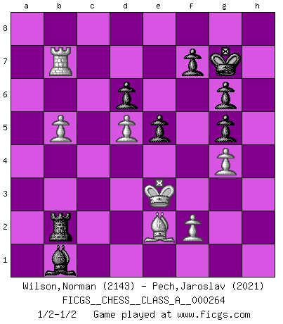 Last move : 1/2-1/2 2023 July 21 4:11:30 [Event "FICGS__CHESS__CLASS_A__000264"] [Site "FICGS"] [Date "2022.12.13"] [Round "1"] [White "Wilson,Norman"] [Black "Pech,Jaroslav"] [Result "1/2-1/2"] [WhiteElo "2143"] [BlackElo "2021"] 1.e4 c5 2.Nf3 Nc6 3.d4 cxd4 4.Nxd4 Nf6 5.Nc3 e5 6.Ndb5 d6 7.Nd5 Nxd5 8.exd5 Nb8 9.Qd3 a6 10.Qa3 Be7 11.Bd2 O-O 12.Bb4 axb5 13.Qxa8 Na6 14.Bd2 Bg5 15.Qa7 Bxd2+ 16.Kxd2 Bf5 17.Be2 Qh4 18.Qe3 Nb4 19.g3 Qf6 20.h4 Nxc2 21.Qg5 Nxa1 22.Rxa1 Rc8 23.b4 Qxg5+ 24.hxg5 Rc2+ 25.Ke3 Rb2 26.a4 bxa4 27.Rxa4 h6 28.Ra8+ Kh7 29.b5 hxg5 30.Rb8 Bb1 31.g4 g6 32.Rxb7 Kg8 33.Rb8+ Kg7 34.Rb7 1/2-1/2 Follow this game move after move (download)As one by one I mowed them down, my superiority soon became apparent. (Jose Capablanca) Bis jetzt ist Weiß einer wohlbekannten Analyse gefolgt. Aber jetzt begeht er einen schrecklichen Fehler: Er beginnt seinen eigenen Kopf zu benutzen. (Siegbert Tarrasch) El Ajedrez es el arte del análisis. (Mikhail Botvinnik) Votre prénom est 'Tactique', votre deuxième prénom est 'Tactique' et votre nom est 'Tactique'. (Ken Smith) I think your argument is specious - I think your tie is ugly. (Gregory House to Dr. Foreman, House M.D.)