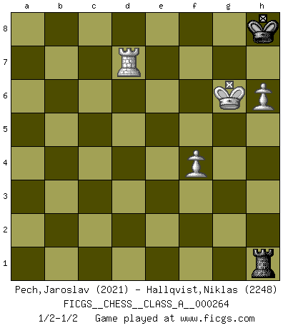 Last move : 1/2-1/2 2024 July 17 21:40:3 [Event "FICGS__CHESS__CLASS_A__000264"] [Site "FICGS"] [Date "2022.12.13"] [Round "1"] [White "Pech,Jaroslav"] [Black "Hallqvist,Niklas"] [Result "1/2-1/2"] [WhiteElo "2021"] [BlackElo "2248"] 1.d4 e6 2.c4 b6 3.e4 Bb4+ 4.Bd2 Bxd2+ 5.Qxd2 d5 6.Bd3 Nc6 7.Nf3 dxe4 8.Bxe4 Bb7 9.Nc3 Nf6 10.Bc2 O-O 11.O-O-O Nb4 12.Bb1 c5 13.dxc5 Qc7 14.Qd6 Qxc5 15.Qxc5 bxc5 16.Rhg1 Bxf3 17.gxf3 h6 18.Ne4 Nxe4 19.Bxe4 Rab8 20.a3 f5 21.axb4 fxe4 22.bxc5 Rb4 23.b3 Rxb3 24.Rd7 Rf7 25.Kc2 Rbxf3 26.c6 R3f5 27.Kc3 Rc5 28.Rd6 Rc7 29.Rd7 R7xc6 30.R1xg7+ Kf8 31.Rdf7+ Ke8 32.Rxa7 Rxc4+ 33.Kd2 Rd6+ 34.Ke2 Kf8 35.Rgf7+ Kg8 36.Rfb7 Rc8 37.Ke3 Rd5 38.Rg7+ Kf8 39.Raf7+ Ke8 40.Ra7 Rc3+ 41.Kf4 Rf5+ 42.Kxe4 Rc4+ 43.Kd3 Rc8 44.Rg8+ Rf8 45.Rxf8+ Kxf8 46.Rh7 Kg8 47.Rxh6 Kf7 48.Ke4 Rc4+ 49.Ke5 Rc5+ 50.Kf4 Rf5+ 51.Kg3 Rg5+ 52.Kf3 Rf5+ 53.Kg3 Rg5+ 54.Kf3 Rf5+ 55.Kg3 e5 56.Rh4 Ke6 57.Re4 Rg5+ 58.Rg4 Rh5 59.h4 Kf5 60.f3 Rh6 61.Rg5+ Ke6 62.h5 Rf6 63.Kg4 Rf4+ 64.Kg3 Rf6 65.Rg4 Rh6 66.Kh4 Kf5 67.Rg5+ Kf6 68.Kg4 Rh8 69.Rg6+ Kf7 70.Kg5 Re8 71.Kf5 Rc8 72.h6 Rc2 73.Rd6 Kg8 74.Kxe5 Rc5+ 75.Rd5 Rc7 76.Kf6 Kh7 77.Kg5 Rc1 78.Rd7+ Kh8 79.f4 Rg1+ 80.Kf5 Rh1 81.Kg5 Rg1+ 82.Kf6 Rh1 83.Kg6 1/2-1/2 Follow this game move after move (download)Chess is the art which expresses the science of logic. (Mikhail Botvinnik) Im Leben werden Partien nie so unstrittig gewonnen wie im Spiel (Emanuel Lasker) No existe un remordimiento como el remordimiento del Ajedrez. (H. G. Wells) J'ai vu le vaincu d'Echecs jouer des années durant dans l'espoir de la fête de la victoire. Car tu es plus riche de ce qu'elle existe si même elle n'est point pour toi. Ainsi de la perle du fond des mers. (Antoine de Saint-Exupéry) The absolute truth is the thing that makes people laugh. (Carl Reiner)