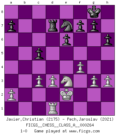 Last move : 1-0 2023 July 5 14:44:30 [Event "FICGS__CHESS__CLASS_A__000264"] [Site "FICGS"] [Date "2022.12.13"] [Round "1"] [White "Javier,Christian"] [Black "Pech,Jaroslav"] [Result "1-0"] [WhiteElo "2175"] [BlackElo "2021"] 1.g3 d5 2.Nf3 c5 3.Bg2 Nc6 4.d4 e6 5.O-O Nf6 6.c4 dxc4 7.dxc5 Qxd1 8.Rxd1 Bxc5 9.Nbd2 c3 10.bxc3 O-O 11.Nb3 Be7 12.Nfd4 Bd7 13.Nb5 Ne5 14.Ba3 Bxa3 15.Nxa3 Bc6 16.f4 Neg4 17.Bxc6 bxc6 18.h3 Ne3 19.Rd3 Nf5 20.Kf2 Rad8 21.Kf3 Rxd3+ 22.exd3 Rd8 23.Nc5 Nd7 24.Nxd7 Rxd7 25.Rd1 h6 26.Nc4 c5 27.Ne5 Rb7 28.Nc4 Rd7 29.Ne3 Ne7 30.Ke2 1-0 Follow this game move after move (download)Not only will I predict his triumph over Botvinnik, but I'll go further and say that he'll probably be the greatest Chess player that ever lived. (John Collins) Spiel ein langweiliges Spiel zu Ende und lustige Dinge können passieren. (Hans Ree) El Ajedrez, como cualquier actividad creativa, solo puede existir a través del esfuerzo combinado de aquellos que tienen talento creativo y de aquellos que poseen la habilidad de organizar su trabajo creativo. (Mikhail Botvinnik) Que feriez-vous si vous étiez en train de jouer aux échecs et que la fin du monde arrive ? Je continuerais à jouer. (Saint Borromée) Question: Is 'This statement is paradoxical' a paradoxical statement ? Or is it a meta-paradox ? (Normajean Yates)