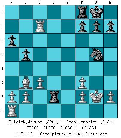 Last move : 1/2-1/2 2023 June 4 23:1:35 [Event "FICGS__CHESS__CLASS_A__000264"] [Site "FICGS"] [Date "2022.12.13"] [Round "1"] [White "Swiatek,Janusz"] [Black "Pech,Jaroslav"] [Result "1/2-1/2"] [WhiteElo "2204"] [BlackElo "2021"] 1.e4 e5 2.Nf3 Nc6 3.Bb5 a6 4.Ba4 Nf6 5.O-O Be7 6.Re1 b5 7.Bb3 O-O 8.c3 d6 9.d4 Bg4 10.Be3 Bh5 11.Nbd2 d5 12.exd5 Nxd5 13.dxe5 Nxe5 14.Bd4 Nc6 15.Be5 Nxe5 16.Rxe5 Nf6 17.Ne4 Nxe4 18.Qxd8 Raxd8 19.Rxe7 Bxf3 20.gxf3 Ng5 21.Rxc7 Rd2 22.Kg2 1/2-1/2 Follow this game move after move (download)If your opponent cannot do anything active, then don't rush the position; instead you should let him sit there, suffer, and beg you for a draw. (Jeremy Silman) Ich war zu klein für die Schach-Schülermannschaft! (Woody Allen) Haz el enroque temprano y seguido. (Rob Sillars) La guerre est enfant de la passion, la passion est enfant du narcissisme et le narcissisme est l'enfant. (...) Une autre partie ? (Thibault de Vassal) Industry executives and analysts often mistakenly talk about strategy as if it were some kind of chess match. But in chess, you have just two opponents, each with identical resources, and with luck playing a minimal role. The real world is much more like a poker game, with multiple players trying to make the best of whatever hand fortune has dealt them. In our industry, Bill Gates owns the table until someone proves otherwise. (David Moschella, 'Computerworld')