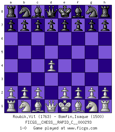 Last move : 1-0 2023 January 20 23:20:34 [Event "FICGS__CHESS__RAPID_C__000293"] [Site "FICGS"] [Date "2022.12.21"] [Round "1"] [White "Roubik,Vit"] [Black "Bomfin,Isaque"] [Result "1-0"] [WhiteElo "1763"] [BlackElo "1500"] 1.d4 1-0 This chess game has been lost on time (started : 2022.12.21 4:15:46) Follow this game move after move (download)Chess is the gymnasium of the mind. (Blaise Pascal) Vom Schach wurde gesagt das Leben sei dafür nicht lange genug. Aber das ist der Fehler des Lebens, nicht des Schach'. (Irving Chernev) Botvinnik trataba de restarle el misterio al Ajedrez, siempre relacionandolo a situaciones de la vida ordinaria. El gustaba de llamar al Ajedrez un típico problema inexacto similar a aquellos de los cuales la gente siempre tiene que enfrentarse en la vida cotidiana. (Garry Kasparov) Le système Elo représente seulement une moyenne. Il est simplement un indicateur de votre stabilité. (Anatoli Karpov) Opportunities multiply as they are seized. (Sun Tzu)