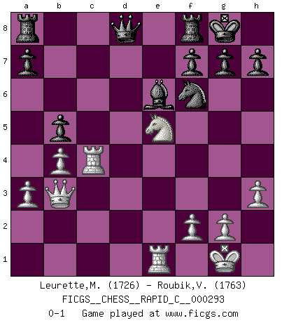 Last move : 0-1 2023 January 10 16:6:1 [Event "FICGS__CHESS__RAPID_C__000293"] [Site "FICGS"] [Date "2022.12.21"] [Round "1"] [White "Leurette,Marc-Antoine"] [Black "Roubik,Vit"] [Result "0-1"] [WhiteElo "1726"] [BlackElo "1763"] 1.e4 c5 2.d4 cxd4 3.c3 dxc3 4.Nxc3 Nc6 5.Nf3 e6 6.Bc4 Bb4 7.Bd2 Nge7 8.a3 Ba5 9.b4 Bc7 10.O-O O-O 11.Re1 Ne5 12.Bf4 Nxc4 13.Bxc7 Qxc7 14.Rc1 Qd8 15.Qb3 d5 16.exd5 exd5 17.Nxd5 Nxd5 18.Rxc4 Nf6 19.h3 Be6 20.Ne5 b5 0-1 Follow this game move after move (download)The defensive power of a pinned piece is only imaginary. (Aaron Nimzovich) Ich bin Weltmeister und muß mit niemandem irgend etwas diskutieren. (Viswanathan Anand) Por la belleza de sus partidas, la claridad de su juego y lo brillante de sus ideas, Fischer se creó el mismo como un artista de la misma estatura como Brahms, Rembrandt y Shakespeare. (David Levy) Les Echecs, c'est l'art de la guerre sans les charniers, c'est la résurrection des morts tombés au champ d'honneur, l'espoir perpétuel, la suprématie de l'intelligence sur la force, la culture de l'esprit. (F. Szpiner) Fame, I have already. Now I need the money. (an elderly Steinitz)
