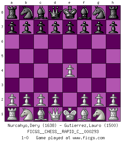 Last move : 1-0 2023 February 1 7:27:28 [Event "FICGS__CHESS__RAPID_C__000293"] [Site "FICGS"] [Date "2022.12.21"] [Round "1"] [White "Nurcahyo,Dery"] [Black "Gutierrez,Lauro"] [Result "1-0"] [WhiteElo "1638"] [BlackElo "1500"] 1.e4 1-0 This chess game has been lost on time (started : 2022.12.21 4:15:46) Follow this game move after move (download)Some sacrifices are sound; the rest are mine. (Mikhail Tal) Je älter ich werde, um so mehr schätze ich die Bauern. (Paul Keres) Un buen jugador siempre tiene buena suerte. (José Raúl Capablanca) Les ravages du H expliquent la différence de niveau entre Tal et Thal [Abergel]. The only thing that matters is the evidence. (Horatio Caine, C.S.I. Miami)