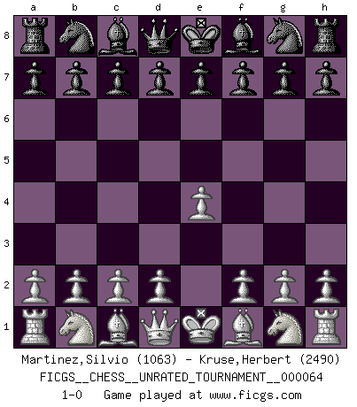 Last move : 1-0 2022 December 21 23:55:29 [Event "FICGS__CHESS__UNRATED_TOURNAMENT__000064"] [Site "FICGS"] [Date "2022.12.21"] [Round "1"] [White "Martinez,Silvio"] [Black "Kruse,Herbert"] [Result "1-0"] [WhiteElo "1063"] [BlackElo "2490"] 1.e4 1-0 Follow this game move after move (download)In Chess, as it is played by masters, chance is practically eliminated. (Emanuel Lasker) Er war ein guter Schachspieler, aber ich kann Leute nicht ausstehen, die 'Heil Hitler' rufen (Über Alexander Aljechin). (Miguel Najdorf) Nada excita más a Grandes Maestros aburridos que una novedad teórica. (Dominic Lawson) Votre prénom est 'Tactique', votre deuxième prénom est 'Tactique' et votre nom est 'Tactique'. (Ken Smith) Creativity is allowing yourself to make mistakes. Art is knowing which ones to keep. (Scott Adams)