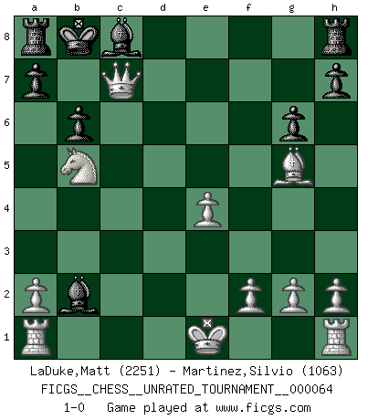 Last move : 1-0 2023 January 28 3:9:37 [Event "FICGS__CHESS__UNRATED_TOURNAMENT__000064"] [Site "FICGS"] [Date "2022.12.21"] [Round "1"] [White "LaDuke,Matt"] [Black "Martinez,Silvio"] [Result "1-0"] [WhiteElo "2251"] [BlackElo "1063"] 1.d4 d5 2.c4 b6 3.cxd5 Qxd5 4.Nc3 Qd8 5.Nf3 Nf6 6.e4 Bb7 7.Bb5+ Nc6 8.Ne5 Nd7 9.Nxc6 e6 10.Nxd8 Kxd8 11.Qh5 g6 12.Qh3 Bg7 13.Bg5+ Kc8 14.Bxd7+ Kxd7 15.d5 Kc8 16.dxe6 fxe6 17.Qxe6+ Kb8 18.Nb5 Bc8 19.Qe7 Bxb2 20.Qxc7+ 1-0 Follow this game move after move (download)Morphy was probably the greatest genius of them all. (Bobby Fischer) Wie gewinnt Tal? Er entwickelt alle seine Figuren in die Brettmitte und opfert sie dann irgendwo. (Robert James Fischer) Me dio la sensación de como si yo estuviera jugando en contra del mismo Ajedrez. - al estar jugando en contra de Robert Fischer (Walter Shipman) Le jeu d'échecs fait naître et fortifie en nous plusieurs qualités précieuses dans le cours de l'existence, telles que la prévoyance, la circonspection, la prudence, et la persévérance. (Benjamin Franklin - 1783, la morale des échecs) The intuitive mind is a sacred gift; the rational mind is a faithful servant. We have created a society that honors the servant but has forgotten the gift. (Albert Einstein)