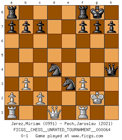 Last move : 0-1 2023 July 30 3:21:38 [Event "FICGS__CHESS__UNRATED_TOURNAMENT__000064"] [Site "FICGS"] [Date "2022.12.21"] [Round "1"] [White "Jerez,Miriam"] [Black "Pech,Jaroslav"] [Result "0-1"] [WhiteElo "0991"] [BlackElo "2021"] 1.e4 e5 2.Nf3 Nc6 3.b3 Nf6 4.Nc3 Bc5 5.Bc4 O-O 6.Bb2 d6 7.d4 exd4 8.Nd5 Nxe4 9.O-O Bg4 10.h3 Bxf3 11.gxf3 Ng5 12.Nf4 d5 13.Bxd5 Bd6 14.Nh5 Nxh3+ 15.Kg2 Qg5+ 16.Ng3 Nf4+ 17.Kg1 Nxd5 18.Bxd4 Bxg3 19.fxg3 Qxg3+ 20.Kh1 Qh4+ 21.Kg1 Nxd4 22.Kg2 Ne3+ 0-1 Follow this game move after move (download)A good player is always lucky. (Jose Raul Capablanca) Wenn Du absolut nicht mehr weißt, was Du tun sollst, dann ist es Zeit für Panik. (John van der Wiel) Debemos de asegurarnos de que el Ajedrez no se convierta en un lenguaje muerto, muy interesante, pero tan solo para un grupo muy pequeño. (Sytze Faber) Assurément je connaissais par expérience le mystérieux attrait de ce jeu royal, le seul entre tous les jeux inventés par les hommes qui échappe souverainement à la tyrannie du hasard, le seul où l'on ne doive sa victoire qu'à son intelligence ou plutôt à une certaine forme d'intelligence. Mais n'est-ce pas déjà le limiter injurieusement que d'appeler les échecs un jeu ? N'est-ce pas une science, un art ou quelque chose qui, comme le cercueil de Mahomet entre ciel et terre, est suspendu entre l'un et l'autre, et qui réunit un nombre incroyable de contraires ? [...] C'est une pensée qui ne mène à rien, une mathématique qui n'établit rien, un art qui ne laisse pas d'uvre, une architecture sans matière; et il l'a prouvé néanmoins qu'il était plus durable, à sa manière, que les livres ou que tout autre monument, ce jeu unique qui appartient à tous les peuples et à tous les temps, et dont personne ne sait quel dieu en fit don à la terre pour tuer l'ennui, pour aiguiser l'esprit et stimuler l'âme. Où commence-t-il, où finit-il ? (Stefan Zweig) Good luck. You're gonna need it. (Han Solo in Star Wars ep.6)