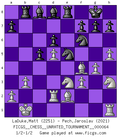 Last move : 1/2-1/2 2023 May 30 14:28:38 [Event "FICGS__CHESS__UNRATED_TOURNAMENT__000064"] [Site "FICGS"] [Date "2022.12.21"] [Round "1"] [White "LaDuke,Matt"] [Black "Pech,Jaroslav"] [Result "1/2-1/2"] [WhiteElo "2251"] [BlackElo "2021"] 1.d4 Nf6 2.Bg5 Ne4 3.Bf4 c5 4.f3 Qa5+ 5.c3 Nf6 6.d5 e6 7.e4 exd5 8.exd5 d6 9.Na3 Be7 10.g4 Nbd7 11.Nc4 Qc7 12.Ne3 O-O 13.Qd2 Ne5 14.O-O-O Qa5 15.Kb1 b5 16.Be2 Rb8 17.h4 b4 18.cxb4 Qxb4 19.Nh3 Bd8 20.b3 Qxd2 21.Rxd2 Re8 22.h5 1/2-1/2 Follow this game move after move (download)Chess is not like life... it has rules ! (Mark Pasternak) Weshalb minderdergeübte Spieler mit g2-g4 beginnen? Die betreffenden sind unschlüssig, ob sie nun rechts (h4) oder links (f4) beginnen sollen, und in ihrer Ratlosigkeit entschliessen sie sich nach guter Bürgerart dazu, den goldenen Mittelweg zu wählen. (Aaron Nimzowitsch) ¿Cual es el objetivo de jugar una apertura de gambito?... Para adquirir una reputación de ser un jugador apuesto a costo de perder el juego. (Siegbert Tarrasch) Un footballeur joue avec ses pieds, parfois avec sa tête. Un joueur d'échecs ne joue qu'avec sa tête. Et quand il ne joue plus, il meurt. (Jacob Murray) Perhaps chess is the wrong game for the times (The Chess Master and the Computer, by Garry Kasparov - 2010)