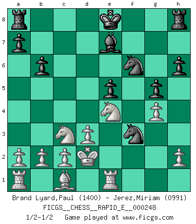 Last move : 1/2-1/2 2023 January 19 0:56:13 [Event "FICGS__CHESS__RAPID_E__000248"] [Site "FICGS"] [Date "2022.12.23"] [Round "1"] [White "Brand Lyard,Paul"] [Black "Jerez,Miriam"] [Result "1/2-1/2"] [WhiteElo "1400"] [BlackElo "0991"] 1.e4 e5 2.Bc4 Nf6 3.Qf3 d5 4.exd5 Bg4 5.Qb3 b6 6.d6 Qd7 7.f3 Be6 8.dxc7 Qxc7 9.Bxe6 fxe6 10.Qxe6+ Qe7 11.Qxe7+ Kxe7 12.d3 Kf7 13.Nh3 Nc6 14.Nc3 Nd4 15.Kd2 Be7 16.Ng5+ Ke8 17.Re1 h6 18.Nge4 g5 19.g4 Nxf3+ 20.Ke2 Nd4+ 21.Kd2 Nf3+ 22.Ke2 Nd4+ 23.Kd2 Nf3+ 1/2-1/2 Follow this game move after move (download)You have to have the fighting spirit. You have to force moves and take chances. (Bobby Fischer) Kleine Schachspieler machen Mist, und große Schachspieler machen Mist, aber große machen weniger Mist. (Fritz Sämisch) El Ajedrez es 99 por ciento táctica. (Teichmann) Dans le domaine de la peinture, de la gravure et de la sculpture, dès la première décennie de notre siècle, les artistes abandonnent la représentation de la partie d'échecs pour se concentrer sur les pièces, sur les échiquiers et sur toutes les variations auxquelles les unes et les autres peuvent donner lieu. On passe en quelque sorte d'un thème social à un thème musical (au sens de la musica médiévale, c'est-à-dire d'une notion qui inclue le rythme, l'harmonie, la construction et la déconstruction, etc.). Graphiquement et picturalement, l'échiquier apparaît comme une structure ouverte, dynamique, d'une richesse infinie, autorisant toutes les combinatoires et débouchant sur des mouvements et des rythmes de nature exponentielle. (Michel Pastoureau) Those parts of the system that you can hit with a hammer (not advised) are called hardware; those program instructions that you can only curse at are called software. (Anonymous)