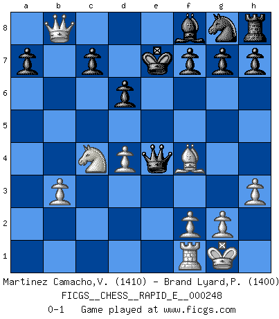 Last move : 0-1 2023 February 17 6:41:55 [Event "FICGS__CHESS__RAPID_E__000248"] [Site "FICGS"] [Date "2022.12.23"] [Round "1"] [White "Martinez Camacho,Victor Hugo"] [Black "Brand Lyard,Paul"] [Result "0-1"] [WhiteElo "1410"] [BlackElo "1400"] 1.e4 e5 2.Nf3 Nc6 3.Bb5 d6 4.d4 Bg4 5.h3 Bxf3 6.Bxc6+ bxc6 7.Qxf3 exd4 8.Bf4 Qf6 9.O-O d3 10.cxd3 Rb8 11.b3 Qxa1 12.Nd2 Qxa2 13.d4 Rb4 14.Qc3 Rb5 15.Qxc6+ Kd8 16.Qxb5 Qc2 17.Qb8+ Ke7 18.Nc4 Qxe4 0-1 This chess game has been lost on time (started : 2022.12.23 16:13:44) Follow this game move after move (download)Chess is ruthless: you've got to be prepared to kill people. (Nigel Short) Kein Schachspieler kann gut schlafen. (H. G. Wells) Un jugador que es sorprendido, esta derrotado a medias. (Proverbio) Le succès, c'est être capable d'aller d'échec en échec sans perdre son enthousiasme. (Winston Churchill) I teach you to lie, cheat and steal, and as soon as my back's turned you wait in line ? (Gregory House, House M.D.)