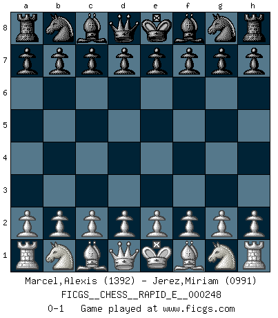 Last move : 0-1 2023 January 22 17:18:22 [Event "FICGS__CHESS__RAPID_E__000248"] [Site "FICGS"] [Date "2022.12.23"] [Round "1"] [White "Marcel,Alexis"] [Black "Jerez,Miriam"] [Result "0-1"] [WhiteElo "1392"] [BlackElo "0991"] 0-1 This chess game has been lost on time (started : 2022.12.23 16:13:44) Follow this game move after move (download)You are for me the Queen on d8 and I am the Pawn on d7 !! (Eduard Gufeld) Der Knackpunkt bei der Konzentration ist, daß wir nur durch sie etwas Neues und Ungewöhnliches am Schachbrett finden können. Sie ist der einzige Weg durch neue neue Ideen eine Überraschung zu bereiten. (Garry Kasparov) El Ajedrez moderno está demasiado preocupado con cosas como la estructura de Peones. Olvidenlo, el Jaque Mate termina la partida. (Nigel Short) Shah mat. Le roi est mort. Cri de fierté d'un joueur venant de terrasser son adversaire, courtoisement, sans effusion de sang. There is a great deal of difference between an eager man who wants to read a book and a tired man who wants a book to read. (G.K. Chesterton)