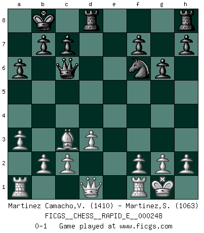 Last move : 0-1 2023 February 27 9:38:39 [Event "FICGS__CHESS__RAPID_E__000248"] [Site "FICGS"] [Date "2022.12.23"] [Round "1"] [White "Martinez Camacho,Victor Hugo"] [Black "Martinez,Silvio"] [Result "0-1"] [WhiteElo "1410"] [BlackElo "1063"] 1.e4 e5 2.Nf3 Nc6 3.Bb5 d5 4.Nxe5 Bd7 5.Nxd7 Qxd7 6.exd5 Qxd5 7.Bxc6+ Qxc6 8.O-O O-O-O 9.Nc3 Nf6 10.d3 Kb8 11.Be3 Bb4 12.Bd2 a6 13.a3 Bxc3 14.Bxc3 g6 0-1 This chess game has been lost on time (started : 2022.12.23 16:13:44) Follow this game move after move (download)That's what Chess is all about. One day you give your opponent a lesson, the next day he gives you one. (Bobby Fischer) Jede Eröffnung ist gut genug um gespielt zu werden, wenn nur ihr Ruf schlecht genug ist. (Savielly Grigorievitsch Tartakower) ¿Cual es el objetivo de jugar una apertura de gambito?... Para adquirir una reputación de ser un jugador apuesto a costo de perder el juego. (Siegbert Tarrasch) Il a essayé de se convaincre qu'il pourrait empêcher toutes les erreurs et ne jamais perdre. L'horreur ! Gary Kasparov au sujet de Robert Fischer. There are two types of people in this world, good and bad. The good sleep better, but the bad seem to enjoy the waking hours much more. (Woody Allen)