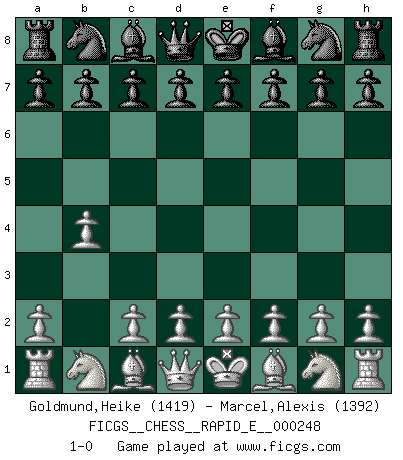 Last move : 1-0 2023 January 23 22:24:46 [Event "FICGS__CHESS__RAPID_E__000248"] [Site "FICGS"] [Date "2022.12.23"] [Round "1"] [White "Goldmund,Heike"] [Black "Marcel,Alexis"] [Result "1-0"] [WhiteElo "1419"] [BlackElo "1392"] 1.b4 1-0 This chess game has been lost on time (started : 2022.12.23 16:13:44) Follow this game move after move (download)When you don't know what to play, wait for an idea to come into your opponent's mind. You may be sure that idea will be wrong. (Siegbert Tarrasch) Ich weiss nicht was Gott gegen mich auf 1.e4 antworten würde. (Robert James Fischer) Debió haber existido una vez en que los hombres eran semidióses, de otra manera no hubiesen podido inventar el Ajedrez. (Gustav Schenk) La vie et les Echecs sont tous les deux une lutte constante. (Lasker) Information on the Internet is subject to the same rules and regulations as conversation at a bar. (George Lundberg)