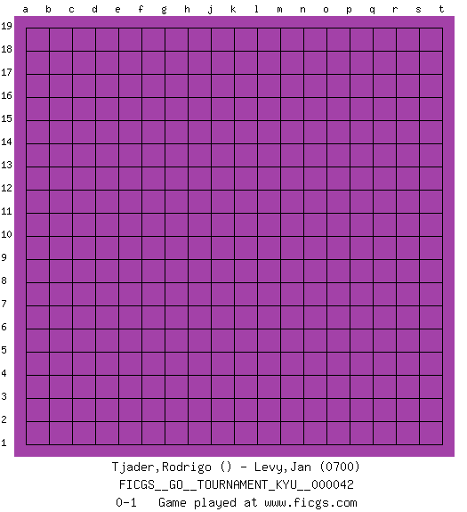Last move : 0-1 2007 September 20 3:4:20 [Event "FICGS__GO__TOURNAMENT_KYU__000042"] [Site "FICGS"] [Date "2007.08.21"] [Round "1"] [Black "Tjader,Rodrigo"] [White "Levy,Jan"] [Result "0-1"] [Rating 2 "0700"] 0-1 This go game has been lost on time (started : 2007.08.21 1:41:46) Here are the names of the openings (joseki) played in the four corners : Player White won this Go (weiqi, baduk) game. Follow this game move after move (download)Against three in a row, play right in the center. (Anonymous) This is where the fun begins. (Anakin Skywalker in Star Wars ep.3)