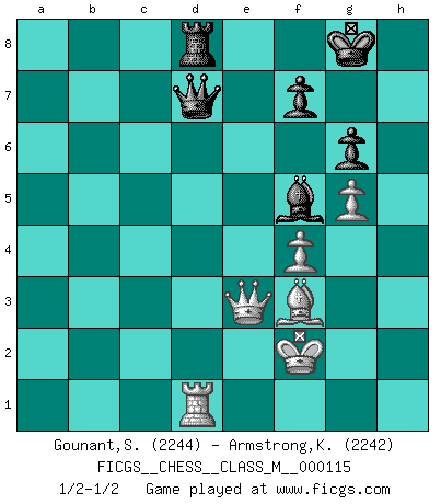 Last move : 1/2-1/2 2023 May 3 7:2:9 [Event "FICGS__CHESS__CLASS_M__000115"] [Site "FICGS"] [Date "2022.12.26"] [Round "1"] [White "Gounant,Stanislas"] [Black "Armstrong,Keith"] [Result "1/2-1/2"] [WhiteElo "2244"] [BlackElo "2242"] 1.c4 e5 2.g3 Nf6 3.Nc3 Bb4 4.Bg2 O-O 5.e4 Bxc3 6.bxc3 c6 7.Ne2 d5 8.cxd5 cxd5 9.exd5 Nxd5 10.O-O Nc6 11.d4 Bg4 12.f3 Bf5 13.g4 Bc8 14.c4 Nb6 15.c5 exd4 16.cxb6 d3 17.bxa7 Rxa7 18.Be3 dxe2 19.Qxe2 Ra4 20.Qb2 Qe7 21.Rfe1 Be6 22.a3 Rfa8 23.Rac1 h5 24.h3 Qxa3 25.Qxb7 Nd4 26.f4 Re8 27.Qb6 Rb4 28.Qd6 Qb2 29.Bxd4 Rxd4 30.Rc2 Qxc2 31.Qxd4 hxg4 32.hxg4 Rf8 33.Be4 Qc7 34.g5 Rd8 35.Qe3 Qd7 36.Kf2 Bf5 37.Bf3 g6 38.Rd1 1/2-1/2 Follow this game move after move (download)Chess is war over the board. The object is to crush the opponents mind. (Bobby Fischer) Stelle das Brett so, daß die Sonne in die Augen deines Gegners scheint. (Ruy López) El Ajedrez hace al hombre ser mas sabio y ver mas claro. (Vladimir Putin) Il vaut mieux sacrifier les pièces de l'adversaire. (Xavier Tartacover) History is the quarrels of popes and kings, with wars or pestilences in every page; the men all so good for nothing, and hardly any women at all. (Jane Austen)