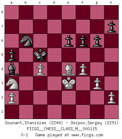 Last move : 0-1 2023 January 8 23:52:49 [Event "FICGS__CHESS__CLASS_M__000115"] [Site "FICGS"] [Date "2022.12.26"] [Round "1"] [White "Gounant,Stanislas"] [Black "Osipov,Sergey"] [Result "0-1"] [WhiteElo "2244"] [BlackElo "2291"] 1.c4 Nf6 2.Nf3 e6 3.g3 d5 4.Bg2 Be7 5.O-O O-O 6.b3 c5 7.Bb2 d4 8.b4 Re8 9.bxc5 Bxc5 10.e3 Nc6 11.exd4 Nxd4 12.Nxd4 Bxd4 13.Bxd4 Qxd4 14.Na3 a6 15.Rb1 Rb8 16.d3 Rd8 17.Qc1 Qd6 18.Rd1 Qc7 19.Qe3 Bd7 20.Qb6 Qxb6 21.Rxb6 Ba4 22.Rd2 Nd7 23.Rxb7 Rxb7 24.Bxb7 Nc5 25.Bf3 Rxd3 26.Rxd3 Nxd3 27.Bb7 Nc5 28.Ba8 Kf8 29.f4 Ke7 30.Kf2 Kd6 31.Ke2 f6 32.Ke3 Nd7 33.Bb7 a5 34.Be4 g6 35.Nb5+ Kc5 36.Na3 Nb6 0-1 Follow this game move after move (download)I have added these principles to the law: get the Knights into action before both Bishops are developed. (Emanuel Lasker) Ich kenne Menschen, die allen Willen der Welt besitzen und doch nicht Schach spielen können. (Robert James Fischer) Una partida de Ajedrez se divide en 3 etapas: la primera cuando piensas que tienes la ventaja, la segunda cuando crees que tienes la ventaja y la tercera... ¡cuando te das cuenta que vas a perder!. (Savielly Tartakower) Comme les marins qui ont mille raisons différentes d'aller en mer, les joueurs d'échecs en ont tout autant avant de s'installer devant une table et jouer... (Vincent Bertignac, philosophe) You know what they say : You lie down with the Devil, you wake up in Hell. (Horatio Caine, C.S.I. Miami)