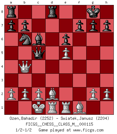 Last move : 1/2-1/2 2023 January 29 16:28:57 [Event "FICGS__CHESS__CLASS_M__000115"] [Site "FICGS"] [Date "2022.12.26"] [Round "1"] [White "Ozen,Bahadir"] [Black "Swiatek,Janusz"] [Result "1/2-1/2"] [WhiteElo "2252"] [BlackElo "2204"] 1.e4 c5 2.Nf3 Nc6 3.d4 cxd4 4.Nxd4 Nf6 5.Nc3 d6 6.Bg5 e6 7.Qd2 Nxd4 8.Qxd4 Be7 9.O-O-O O-O 10.f4 Qa5 11.Bc4 Bd7 12.e5 dxe5 13.fxe5 Bc6 14.Bd2 Nd7 15.Nd5 Qd8 16.Nxe7+ Qxe7 17.Rhe1 Nb6 18.Bf1 Rfd8 19.Qg4 Qc5 20.Qb4 1/2-1/2 Follow this game move after move (download)Chess is life. (Bobby Fischer) Schachspieler können ausgezeichnet Varianten am Schachbrett berechnen, aber nicht im realen Leben. Zu stark ist der Individualismus im Schach ausgeprägt, und für viele ist ein kleiner momentaner persönlicher Vorteil wichtiger als ein weit größerer Vorteil von morgen. (Anatoly Karpov) Los Peones son nacidos libres, y aún así, se encuentran encadenados por todos lados. (Rick Kennedy) Fischer est le meilleur joueur du monde et Karpov n'est qu'un joueur de bistrot. (Garry Kasparov, agé de 16 ans) Train yourself to let go of everything you fear to lose. (Master Yoda in Star Wars ep.3)