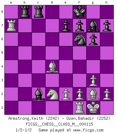 Last move : 1/2-1/2 2023 February 6 7:23:26 [Event "FICGS__CHESS__CLASS_M__000115"] [Site "FICGS"] [Date "2022.12.26"] [Round "1"] [White "Armstrong,Keith"] [Black "Ozen,Bahadir"] [Result "1/2-1/2"] [WhiteElo "2242"] [BlackElo "2252"] 1.Nf3 d5 2.g3 g6 3.d4 Nf6 4.Bg2 Bg7 5.c4 c6 6.O-O O-O 7.b3 dxc4 8.bxc4 c5 9.Bb2 cxd4 10.Nxd4 Qb6 11.Qc2 Nc6 12.c5 Qb4 13.Nxc6 bxc6 14.Bxc6 Rb8 15.Be5 Bf5 16.a3 Bxc2 17.axb4 Rxb4 18.Nd2 Rc8 19.Bc3 R4b8 20.Bg2 Rxc5 21.Bd4 R5c8 22.Rxa7 Kf8 1/2-1/2 Follow this game move after move (download)Excellence at Chess is one mark of a scheming mind. (Sir Arthur Conan Doyle) Das Schachspiel hat wie die Liebe, die Musik, die Fähigkeit, den Menschen glücklich zu machen. Ich habe ein leises Gefühl des Bedauerns für jeden, der das Schachspiel nicht kennt, so wie ich jeden bedaure, der die Liebe nicht kennt. (Siegbert Tarrasch) Cuando tengas duda... ¡juega al Ajedrez!. (Tevis) Tous ces prétendus hommes politiques sont les pions, les Cavaliers, les Tours ou les Fous d'une partie d'échecs qui se jouera tant qu'un hasard ne renversera pas l'échiquier. (Honoré de Balzac) I'll be back. (Arnold Schwarzenegger)