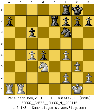 Last move : 1/2-1/2 2023 February 5 23:6:2 [Event "FICGS__CHESS__CLASS_M__000115"] [Site "FICGS"] [Date "2022.12.26"] [Round "1"] [White "Perevozchikov,Vjacheslav"] [Black "Swiatek,Janusz"] [Result "1/2-1/2"] [WhiteElo "2253"] [BlackElo "2204"] 1.Nf3 d5 2.c4 d4 3.b4 c5 4.Bb2 Nf6 5.g3 cxb4 6.Bxd4 Bg4 7.Bb2 Bxf3 8.exf3 e5 9.Bg2 Bc5 10.a3 Nc6 11.O-O bxa3 12.Nxa3 O-O 13.Nc2 Qd3 14.f4 Rad8 15.Ne1 Qxd2 16.Qxd2 Rxd2 17.Bc3 Re2 18.Nd3 Bd4 19.Bxd4 exd4 20.Rfb1 Re7 21.Bxc6 bxc6 1/2-1/2 Follow this game move after move (download)A good sacrifice is one that is not necessarily sound but leaves your opponent dazed and confused. (Rudolph Spielmann) Kein Schachspieler kann gut schlafen. (H. G. Wells) Cada Peón es una Reina en potencia. (James Mason) Toutes les manuvres exécutées sur une colonne ouverte ont pour but ultime l'intrusion définitive sur la septième ou la huitième rangée, en plein cur de la position ennemie. (Aaron Nimzovitch) Life is like internet, nothing interesting, but noone want to leave it. (Ilmars Cirulis)