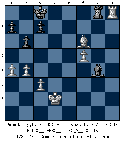 Last move : 1/2-1/2 2023 June 22 23:36:52 [Event "FICGS__CHESS__CLASS_M__000115"] [Site "FICGS"] [Date "2022.12.26"] [Round "1"] [White "Armstrong,Keith"] [Black "Perevozchikov,Vjacheslav"] [Result "1/2-1/2"] [WhiteElo "2242"] [BlackElo "2253"] 1.Nf3 Nf6 2.c4 g6 3.Nc3 d5 4.cxd5 Nxd5 5.h4 Bg7 6.e4 Nxc3 7.dxc3 Qxd1+ 8.Kxd1 Nd7 9.h5 b6 10.Bd3 Bb7 11.Be3 h6 12.hxg6 O-O-O 13.Kc2 fxg6 14.Rae1 Bf6 15.b4 g5 16.a4 g4 17.Nd2 Ne5 18.Be2 h5 19.f4 gxf3 20.gxf3 Rdg8 21.Reg1 h4 22.f4 Rxg1 23.Bxg1 Ng6 24.Bh2 e5 25.f5 Nf4 26.Bg4 Rg8 27.Bf3 Nh3 28.Bxe5 Ng5 29.Bxf6 Nxf3 30.Nxf3 Bxe4+ 31.Kd2 Bxf3 32.Rxh4 Bg4 33.Rh8 1/2-1/2 Follow this game move after move (download)Discovered check is the dive bomber of the Chessboard. (Reuben Fine) Man kann eine Schachpartie nur gewinnen, wenn das Gleichgewicht gestört ist. In einer Stellung mit ungestörtem Gleichgewicht ist auch das größte Genie hilflos - in der Stellung steckt dann eben kein genialer Einfall. (Wilhelm Steinitz) La batalla por la última verdad nunca sera ganada. Y es por eso que el Ajedrez es tan fascinante. (Hans Kmoch) Même un GMI sait rarement calculer sur plus de cinq coups une attaque à sacrifices. (Rudolf Spielmann) Luck has a peculiar habit of favoring those who don't depend on it. (Author unknown)