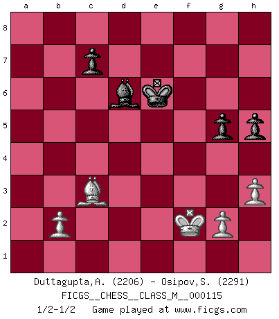 Last move : 1/2-1/2 2023 February 1 12:19:37 [Event "FICGS__CHESS__CLASS_M__000115"] [Site "FICGS"] [Date "2022.12.26"] [Round "1"] [White "Duttagupta,Aniruddha"] [Black "Osipov,Sergey"] [Result "1/2-1/2"] [WhiteElo "2206"] [BlackElo "2291"] 1.e4 e5 2.Nf3 Nc6 3.Bb5 Nf6 4.O-O Nxe4 5.Re1 Nd6 6.Nxe5 Be7 7.Bf1 Nxe5 8.Rxe5 O-O 9.d4 Ne8 10.d5 Bc5 11.Re1 d6 12.Nc3 Bf5 13.Bd3 Qf6 14.Ne4 Bxe4 15.Rxe4 Qxf2+ 16.Kh1 Qf6 17.Rf4 Qe5 18.Bd2 g6 19.Qf3 Ng7 20.Bc3 Qe3 21.Qg4 f5 22.Qh4 Nh5 23.Rf3 Qh6 24.Re1 Rae8 25.Re6 Rxe6 26.dxe6 d5 27.Qe1 Ng7 28.Bd2 g5 29.e7 Re8 30.Bxf5 Rxe7 31.Qf1 Nxf5 32.Rxf5 Bd6 33.h3 Re5 34.Bc3 Rxf5 35.Qxf5 Qg6 36.Qxd5+ Kf8 37.Qxb7 Qxc2 38.Qxa7 Qb1+ 39.Qg1 Qxa2 40.Qf1+ Qf7 41.Qxf7+ Kxf7 42.Kg1 Ke6 43.Kf2 h5 1/2-1/2 Follow this game move after move (download)It is the aim of the modern school, not to treat every position according to one general law, but according to the principle inherent in the position. (Richard Reti) Ich rechne überhaupt nicht voraus. Ich gewinne auch so. (Robert James Fischer) De todos mis libros Rusos, la defensa contiene y difunde el 'calor' mas grande que pudiese verse extraño al observar lo supremamente abstracto que el Ajedrez supuestamente es. (Vladimir Nabokov) Psychologiquement, tu dois avoir confiance en toi même, mais cette confiance doit être basée sur des faits. (Robert Fischer) Only sick music makes money today. (Friedrich Nietzsche)
