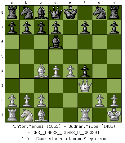 Last move : 1-0 2023 January 6 7:17:20 [Event "FICGS__CHESS__CLASS_D__000291"] [Site "FICGS"] [Date "2022.12.26"] [Round "1"] [White "Pintor,Manuel"] [Black "Budnar,Milos"] [Result "1-0"] [WhiteElo "1652"] [BlackElo "1486"] 1.e4 e5 2.f4 exf4 3.Nf3 g5 4.Bc4 g4 5.O-O gxf3 6.Qxf3 Bc5 7.Kh1 Bd6 8.d4 1-0 Follow this game move after move (download)Man is a frivolous, a specious creature, and like a Chess player, cares more for the process of attaining his goal than for the goal itself. (Dostoyevsky) Ich trinke, ich rauche, ich spiele, ich liebe Frauen aber Fernschach ist ein Laster, das ich nicht habe. (Mikhail Nekhemyevich Tal) ¿Quién es tu oponente esta tarde? Esta tarde mi oponente son las piezas negras. (Akiba Rubinstein) En blitz, le Cavalier l'emporte sur le Fou. (Vlastimil Hort) Pushing plastic is for the many, pushing virtual pieces is for the fewer, pushing wood is for the very few. (Normajean Yates)