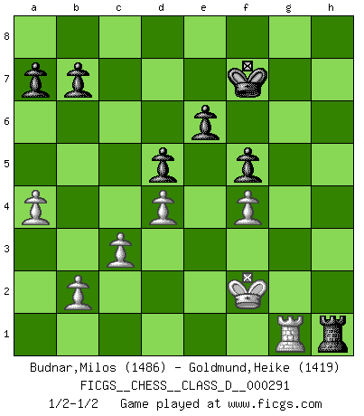 Last move : 1/2-1/2 2023 April 12 17:22:34 [Event "FICGS__CHESS__CLASS_D__000291"] [Site "FICGS"] [Date "2022.12.26"] [Round "1"] [White "Budnar,Milos"] [Black "Goldmund,Heike"] [Result "1/2-1/2"] [WhiteElo "1486"] [BlackElo "1419"] 1.e4 d5 2.exd5 Qxd5 3.h3 Nf6 4.Nf3 Bf5 5.Nc3 Qd8 6.Bb5 c6 7.Ba4 e6 8.a3 Nbd7 9.O-O Nb6 10.Bb3 Nbd5 11.Nxd5 cxd5 12.d3 Be7 13.Bg5 h6 14.Bh4 O-O 15.Ne5 Rc8 16.g4 Nxg4 17.Bxe7 Qxe7 18.Nxg4 Qg5 19.Kh2 Qh4 20.Qf3 h5 21.Ne3 Bg4 22.Nxg4 hxg4 23.Qxg4+ Qh6 24.f4 f5 25.Qg5 Qh7 26.c3 Rf6 27.Rg1 Kf7 28.Bd1 Rh8 29.Bh5+ Qxh5 30.Qxg7+ Ke8 31.Rg3 Rf7 32.Qg6 Qe2+ 33.Rg2 Qf3 34.Qg3 Qh5 35.Kg1 Qxh3 36.Qxh3 Rxh3 37.d4 Rfh7 38.Kf2 Rd3 39.Ke2 Rdh3 40.Rag1 Kf7 41.a4 Rh2 42.Kf2 Rxg2+ 43.Rxg2 Rh1 44.Rg1 1/2-1/2 Follow this game move after move (download)Chess is like war on a board. (Bobby Fischer) Es gibt nur zwei wahre Schachgenies - das andere war Wilhelm Steinitz, der Weltmeister von 1872 bis 1894. (Robert James Fischer) Bobby Fischer es el jugador de Ajedrez mas grande que jamás haya existido. (Ken Smith) Horreur, mais aussi harmonie suprême : qu'y avait-il en effet au monde en dehors des échecs ? Le brouillard, l'inconnu, le non-être... (Vladimir Nabokov) Lamb in skin of tiger, still fears the wolf. (Chinese proverb)