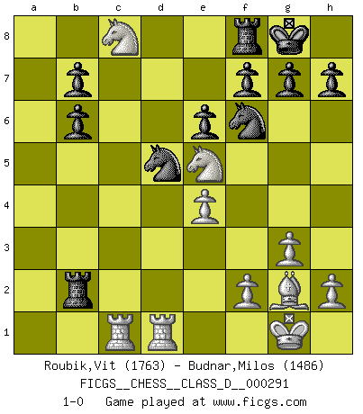 Last move : 1-0 2023 January 23 8:28:15 [Event "FICGS__CHESS__CLASS_D__000291"] [Site "FICGS"] [Date "2022.12.26"] [Round "1"] [White "Roubik,Vit"] [Black "Budnar,Milos"] [Result "1-0"] [WhiteElo "1763"] [BlackElo "1486"] 1.d4 Nf6 2.c4 d5 3.g3 e6 4.Bg2 Bb4+ 5.Bd2 Bxd2+ 6.Nxd2 O-O 7.Rc1 dxc4 8.Nxc4 c6 9.Nf3 Nbd7 10.O-O c5 11.Nd6 cxd4 12.Qxd4 Nb6 13.Rfd1 Nbd5 14.Qc5 Qb6 15.Qxb6 axb6 16.Ne5 Rxa2 17.Nxc8 Rxb2 18.e4 1-0 Follow this game move after move (download)It is peculiar but a fact nevertheless, that gamblers in chess always have enthusiastic followers. (Botvinnik) Ich verachte Kasparow. (Viktor Kortschnoi) El Ajedrez es una guerra en un tablero. El objetivo es aplastar la mente del oponente. (Bobby Fischer) Shah mat. Le roi est mort. Cri de fierté d'un joueur venant de terrasser son adversaire, courtoisement, sans effusion de sang. Looking at the proliferation of personal web pages on the Net, it looks like very soon everyone on Earth will have 15 megabytes of fame. (M.G. Sriram)