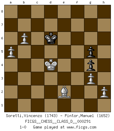 Last move : 1-0 2023 February 11 3:4:54 [Event "FICGS__CHESS__CLASS_D__000291"] [Site "FICGS"] [Date "2022.12.26"] [Round "1"] [White "Soretti,Vincenzo"] [Black "Pintor,Manuel"] [Result "1-0"] [WhiteElo "1743"] [BlackElo "1652"] 1.e4 e5 2.Nf3 Nc6 3.Bb5 Qf6 4.c3 Bc5 5.d3 Qg6 6.O-O d6 7.d4 exd4 8.cxd4 Bb6 9.d5 a6 10.Ba4 Nge7 11.dxc6 Nxc6 12.Qd5 Bd7 13.Nc3 O-O 14.Qb3 Bg4 15.Nh4 Qh5 16.Nf5 Bxf5 17.exf5 Nd4 18.Qd5 Nxf5 19.Qxb7 Nh4 20.Bd1 Qg6 21.Qe4 Nf5 22.Ba4 Nd4 23.Qxg6 hxg6 24.Be3 c5 25.Bxd4 cxd4 26.Nd5 Rab8 27.Nxb6 Rxb6 28.b3 f5 29.Rad1 Rc8 30.Rxd4 Kf7 31.Rd2 Rc5 32.Rfd1 Ke6 33.Be8 g5 34.Re1+ Re5 35.Rxe5+ Kxe5 36.Bf7 Rb5 37.Bc4 Rc5 38.Bxa6 d5 39.f3 d4 40.b4 Rc3 41.b5 d3 42.Kf2 Rc2 43.Ke3 Rxd2 44.Kxd2 Kd5 45.Kxd3 Kc5 46.a4 Kd5 47.b6 Kc6 48.a5 g4 49.fxg4 fxg4 50.g3 Kd6 51.Kd4 g5 52.Be2 1-0 Follow this game move after move (download)The combination player thinks forward; he starts from the given position, and tries the forceful moves in his mind. (Emanuel Lasker) In der Schule lernt man nichts. Es ist nur Zeitverschwendung. (Robert James Fischer) Cuando tu no sabes absolutamente que mas hacer, es tiempo de entrar en pánico. (John van der Wiel) Tous ces prétendus hommes politiques sont les pions, les Cavaliers, les Tours ou les Fous d'une partie d'échecs qui se jouera tant qu'un hasard ne renversera pas l'échiquier. (Honoré de Balzac) I just play for fun. (Anna Kournikova)