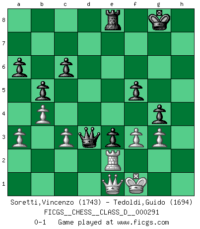 Last move : 0-1 2023 May 28 8:7:32 [Event "FICGS__CHESS__CLASS_D__000291"] [Site "FICGS"] [Date "2022.12.26"] [Round "1"] [White "Soretti,Vincenzo"] [Black "Tedoldi,Guido"] [Result "0-1"] [WhiteElo "1743"] [BlackElo "1694"] 1.d4 e6 2.e4 d5 3.exd5 exd5 4.Nf3 Nc6 5.Bb5 h6 6.O-O Bd7 7.Nc3 Nf6 8.Re1+ Be7 9.Qe2 a6 10.Ba4 b5 11.Bb3 Be6 12.a3 O-O 13.Bd2 Re8 14.Ne5 Nxd4 15.Qd3 Nxb3 16.cxb3 Qd6 17.Re2 Ne4 18.Nf3 Nxd2 19.Rxd2 c6 20.Rad1 Rad8 21.b4 g6 22.Nd4 Bf6 23.Nxe6 Rxe6 24.f3 Be5 25.g3 Bxc3 26.bxc3 Qe7 27.Kf2 Re8 28.Qf1 Qf6 29.Rd3 h5 30.R1d2 Qf5 31.Rd4 Re4 32.Rxe4 dxe4 33.Kg2 e3 34.Re2 g5 35.Qe1 Qd3 36.h3 f5 37.Kf1 g4 38.hxg4 hxg4 0-1 Follow this game move after move (download)Adequate compensation for a sacrifice is having a sound combination leading to a winning position; adequate compensation for a blunder is having your opponent snatch defeat from the jaws of victory. (Bruce A. Moon) Schach ist gnadenlos. Du mußt bereit sein zu töten. (Nigel Short) Un Peón pasado aumenta su poder a medida de que el número de piezas en el tablero disminuye. (Capablanca) Tout change constamment, y compris dans le monde des Echecs. (Botvinnik) The quality of decision is like the well-timed swoop of a falcon which enables it to strike and destroy its victim. (Sun Tzu)
